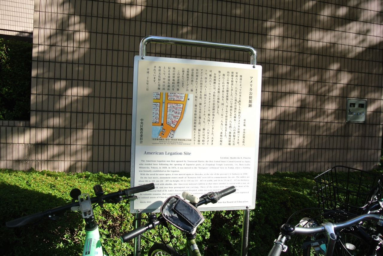 聖路加タワーの前に中央区教育委員会による案内板が設置されていました。領事館が赤坂の現在地に移った後は記念碑が設置されていたそうで、そのうち3つはトイスラー記念館の前で確認できましたが、聖路加ガーデン内にある2つというのが確認できませんでした。