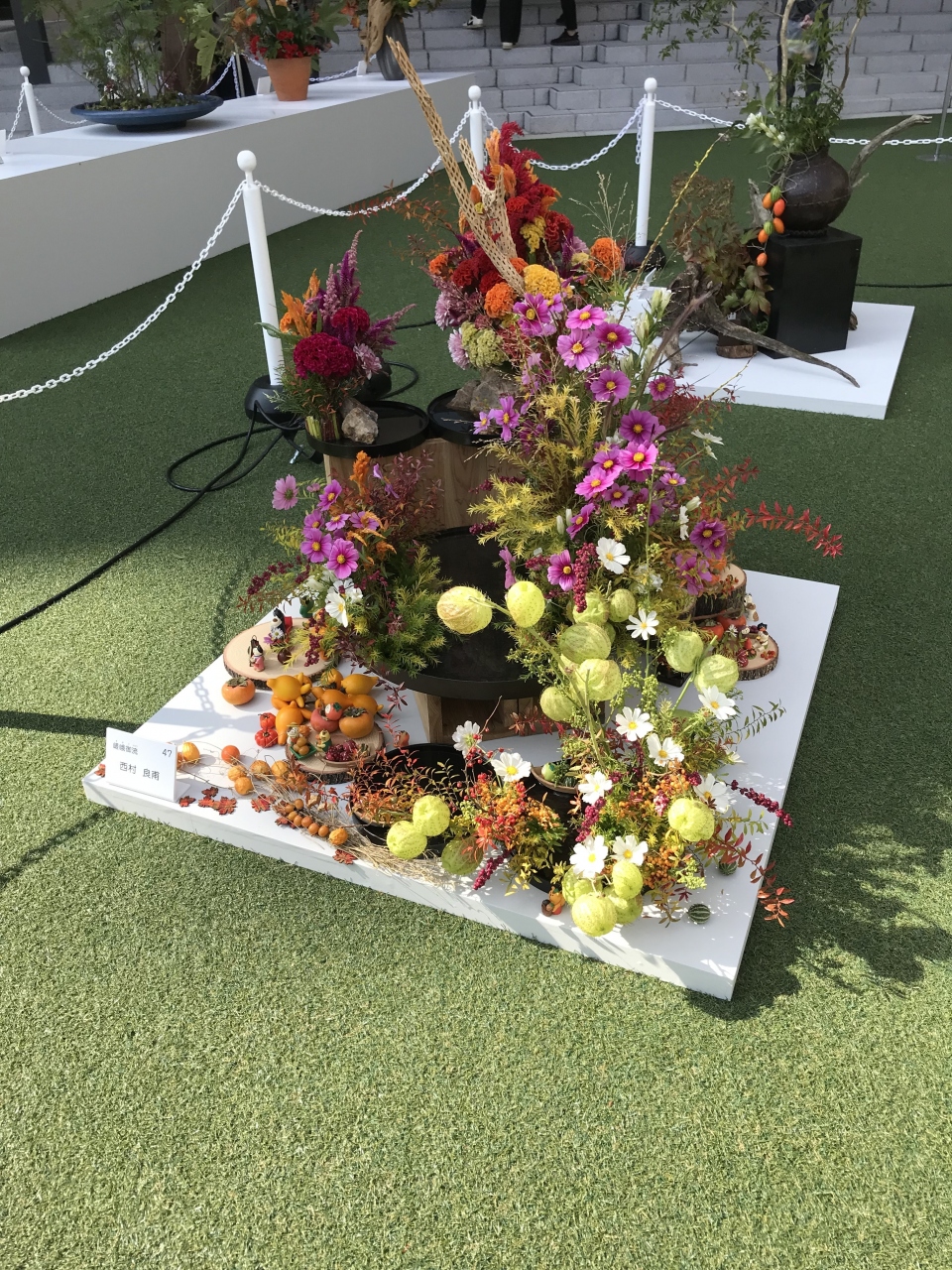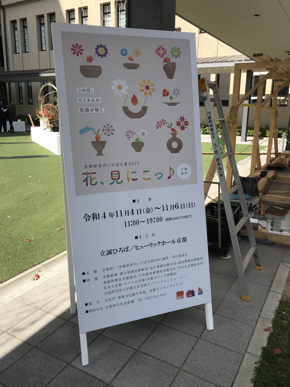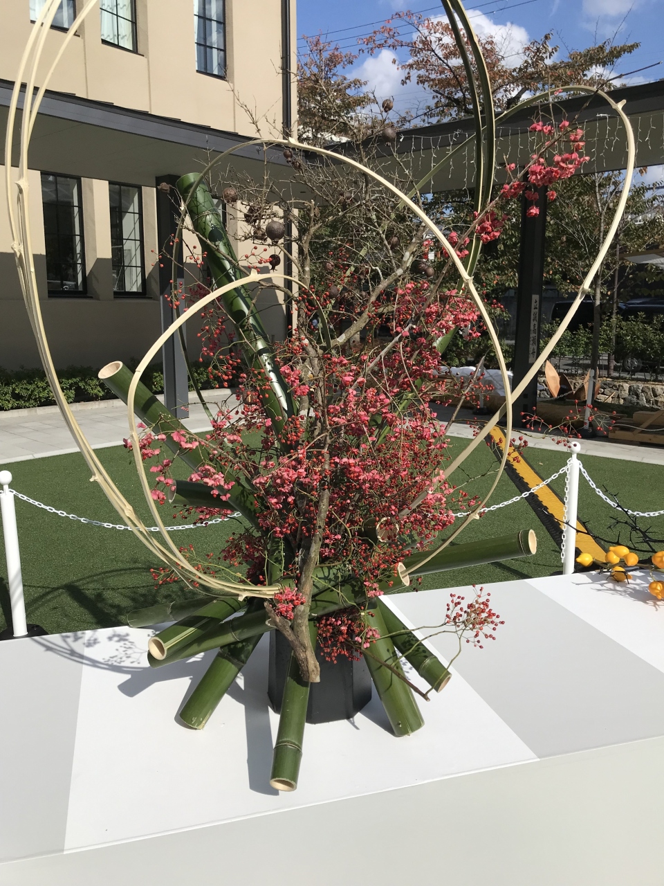 立誠ガーデンヒューリック京都は、高瀬川沿いにあります。旧立誠小学校をリノベーションした施設で、旧校舎と新棟からなる複合商業施設になっています。中庭の芝生で何かやっているので見学すると、創作いけばな展を行っていました。若手華道家による素晴らしいいけばなでした。建物の中でも、薄暗い中のいけばなにスポットライト当てていて幻想的でした。