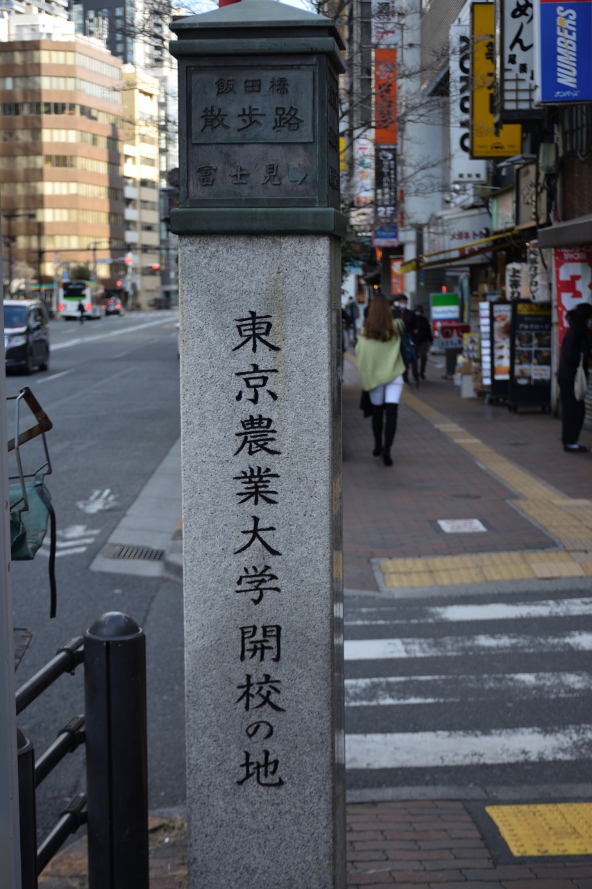 飯田橋駅から続く道には学校の開校を残す石碑が多く建てられています。東京農業大学開校もその一つです。かつてここに東京農業大学が解説され名残として石碑が建てられています。歩道の上に小さな石碑が建っています。