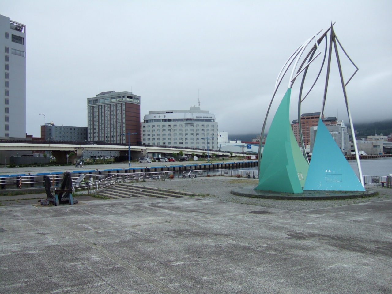 函館駅西口から函館朝市わきを通って徒歩5分ほど、青函連絡船摩周丸が係留されている岸壁横にある広場です。