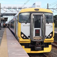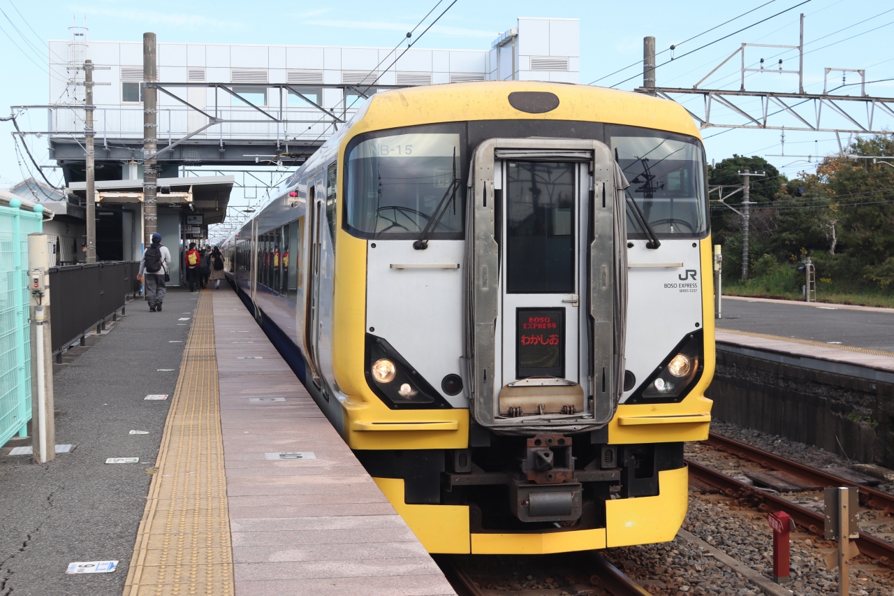 東京から京葉線経由で運転される外房線の特急です。以前に比べ少なくなりましたが、内房線の「さざなみ」に比べ本数は確保されていました。乗車した1号はわずか5両編成で自由席は2両、あらかじめ特急券を用意しない短距離客で結構混んでいました。
