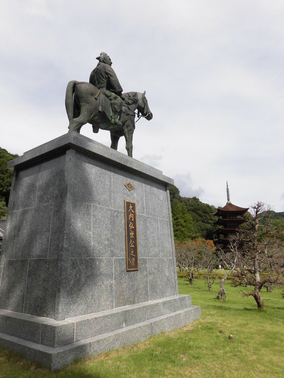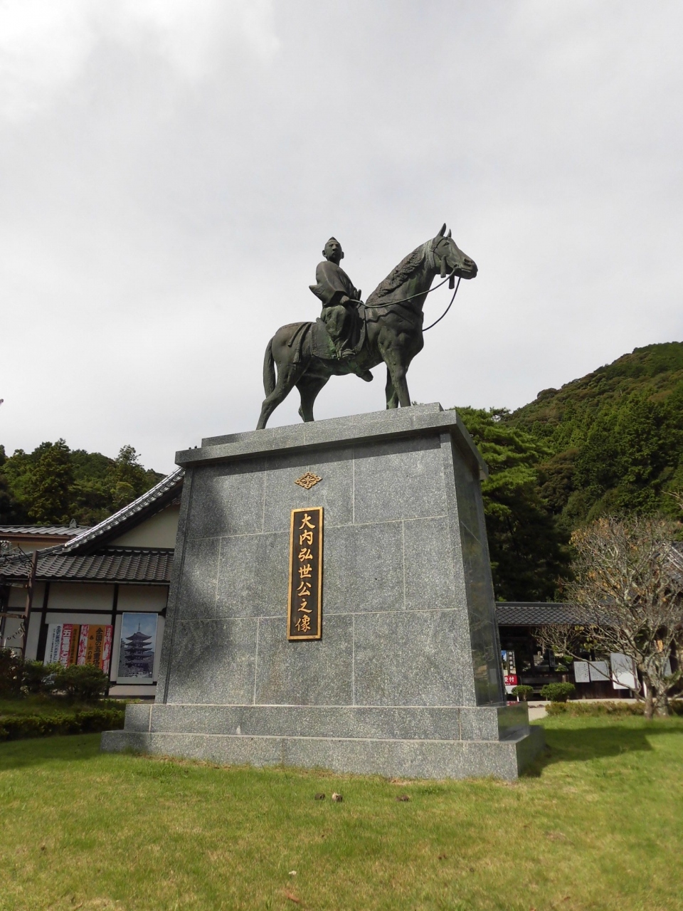 観光旅行で山口を訪れたときに立ち寄った瑠璃光寺がある香山公園内に、銅像が立てられていたので立ち寄ってみました。山口の街を造り上げた大内弘世の像で、馬上から見下ろす視線の先は、山口城下が広がっているような気がしました。