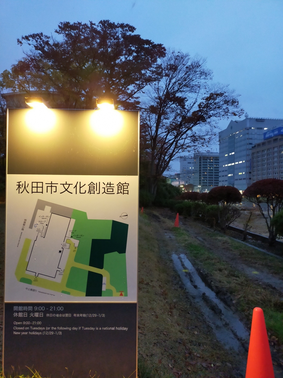 秋田市美術館のカフェの正面から見えて、夕暮れどきで素敵な建物だなと思っていったわけですが、中は無料で休める?スペースがあり、学生さんたちが勉強していたりしました。期間限定の展示があったのですが、とてもモダンな雰囲気でした。