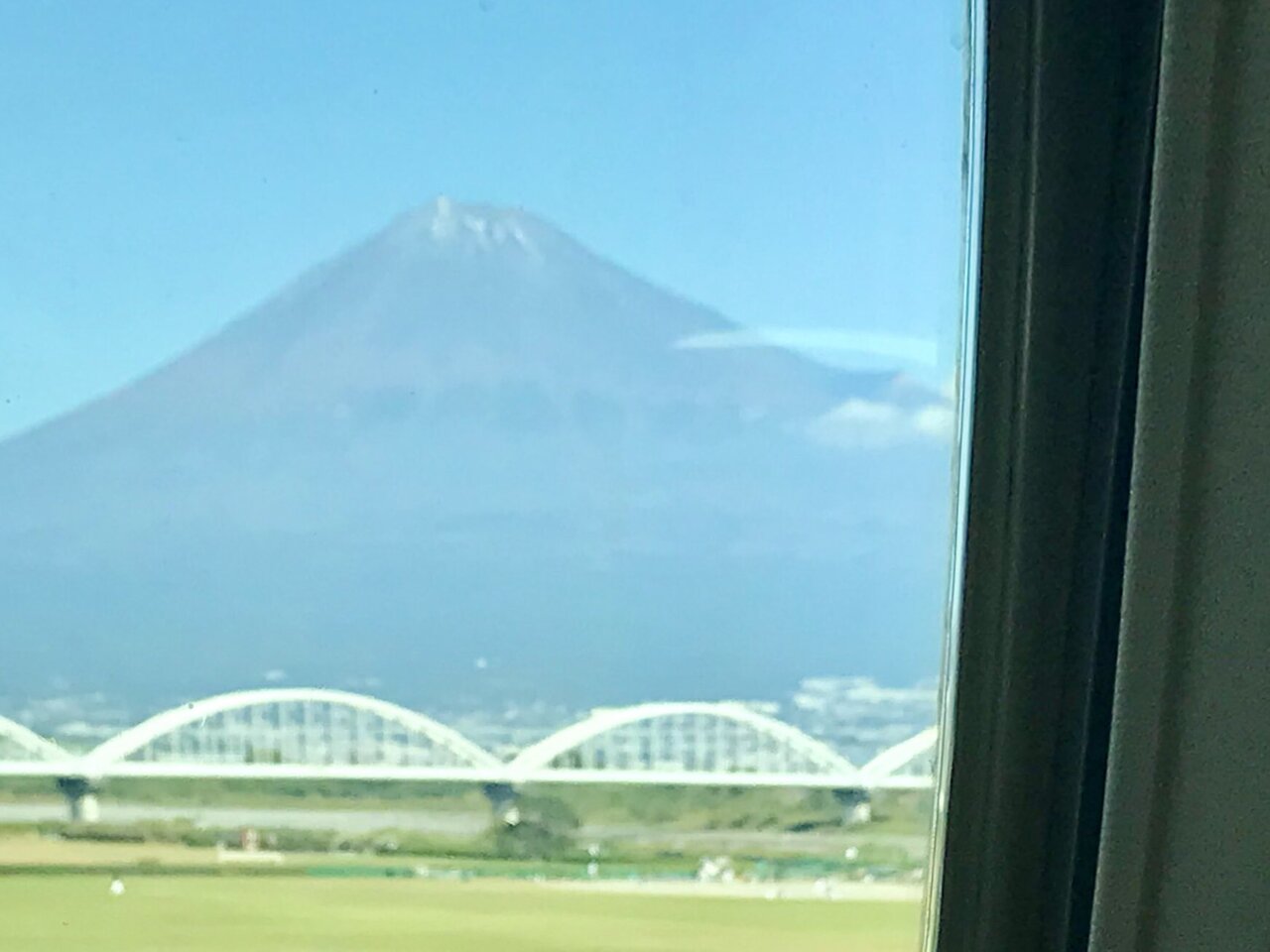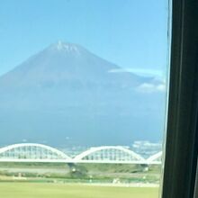 下りの場合、新幹線からは右側に富士山が見えます。これからの時期、晴天率も高くなり、空気も乾燥する冬季間は、富士山が見える確率が高くなります。おすすめ地点は、東京から下り、新富士駅を通過してすぐ、富士川を渡るあたりが、一番良いですよ!