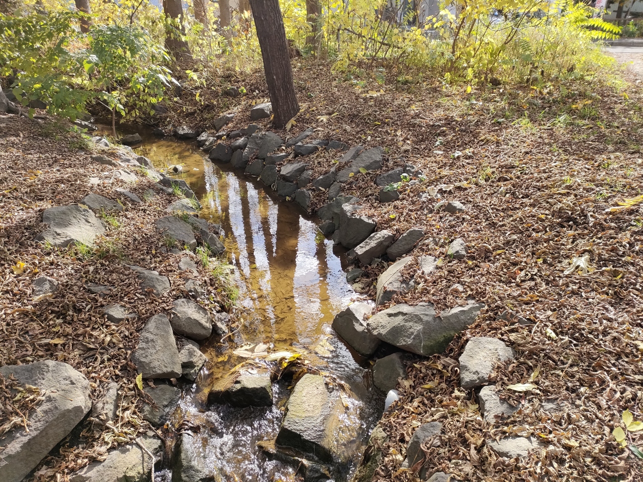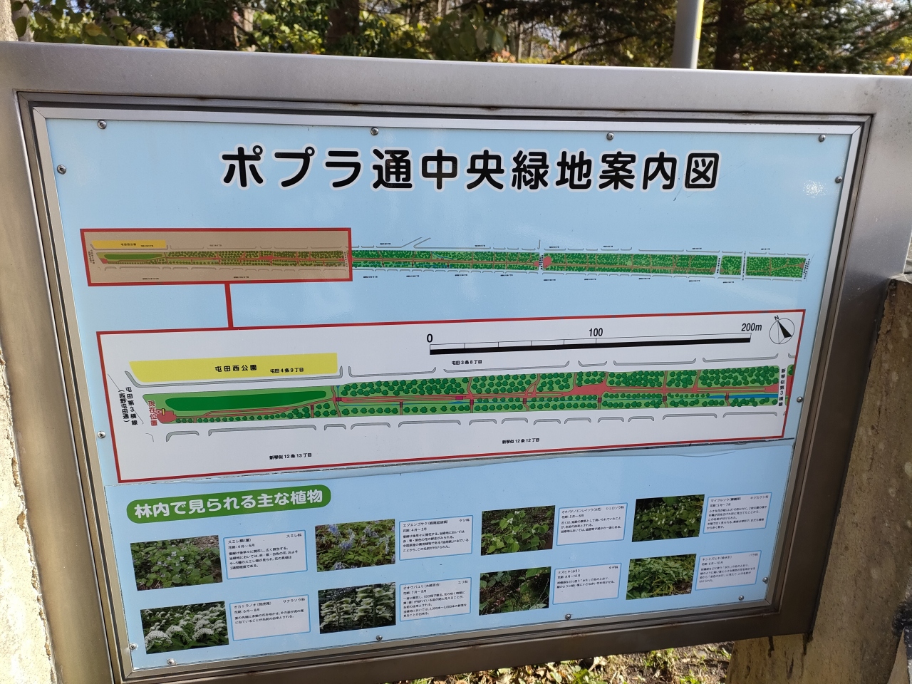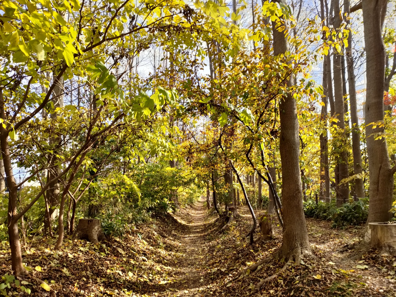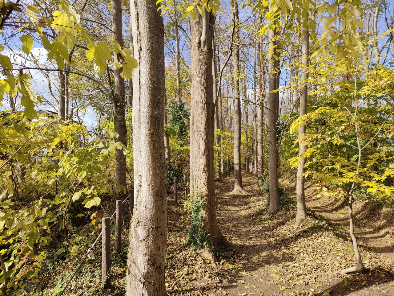 見所となるのは、屯田西公園と琴似栄町通りの間、約2.2kmで、森の中を散策路がずっと続いています。森は幅が2、30mほどあるため、非舗装の散策路を行くと、登山で山の中を歩いているような雰囲気に包まれます(車の音や、木々の隙間から住宅地が垣間見えますが…)。何より、山まで行かなくても、アクセスが比較的良い街中で森林散策が楽しめるほか、山のようにきついアップダウンが無いのが楽チンで良いですネ。