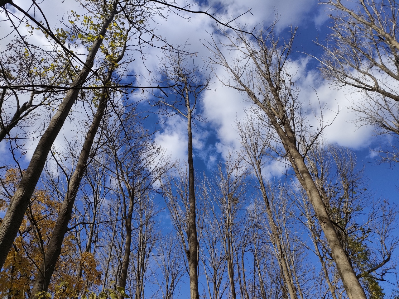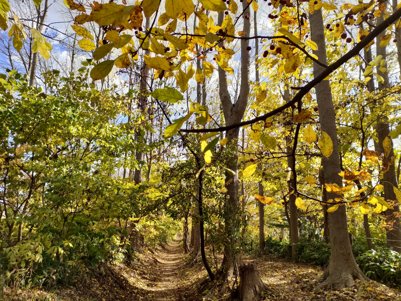 10月下旬から11月上旬にかけて紅(黄)葉が見頃となっていました。11月上旬の状況としては、高木の上の方は既に葉が散っていて、上の木々で守られて紅葉が遅れる低木の方がよく紅(黄)葉していましたが、この時期ともなると、手稲山頂上や定山渓の辺りは雪も降る頃で、防風林の辺りでも最高気温が9℃と寒い1日だったので、散策には防寒具の準備も必要でした。