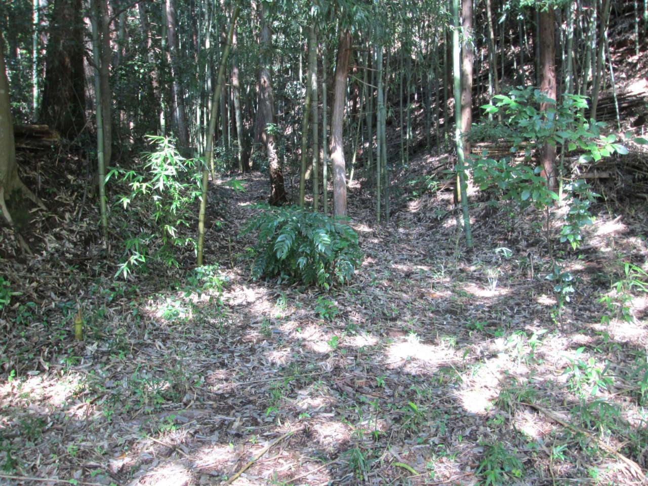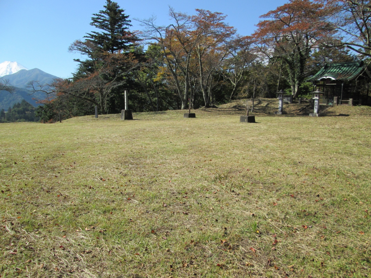 築城主は小山田信有、1704年秋元氏の転封により廃城。築城年は1532年?小山田氏の居館谷村館の詰城であったが現在は城山公園になっている。城山山頂(標高571M)に本丸があり、その他、西麓に外堀、南西隅に櫓台、石垣(山頂手前)、西側の巨大な内堀、土塁、帯郭、北の尾根先に竪堀、堀切等が見られる。桂川は天然の堀になっている。山城を構成する多くの遺構が見られます。トップクラスには行きませんが、お城ファンには見逃せない山城です