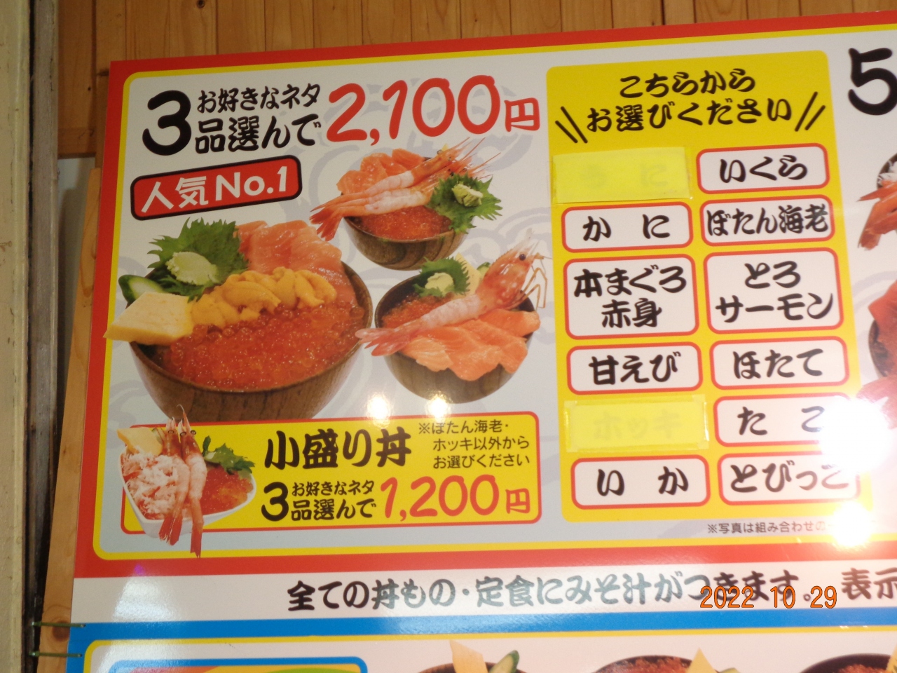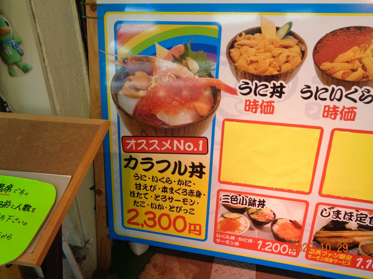 予定では多くは食べれないのでお得な「学割丼」にしようかと行きました。店の前のメニューを見て迷いに迷って「カラフル丼」(=10種のネタ=2300円)に変えました。