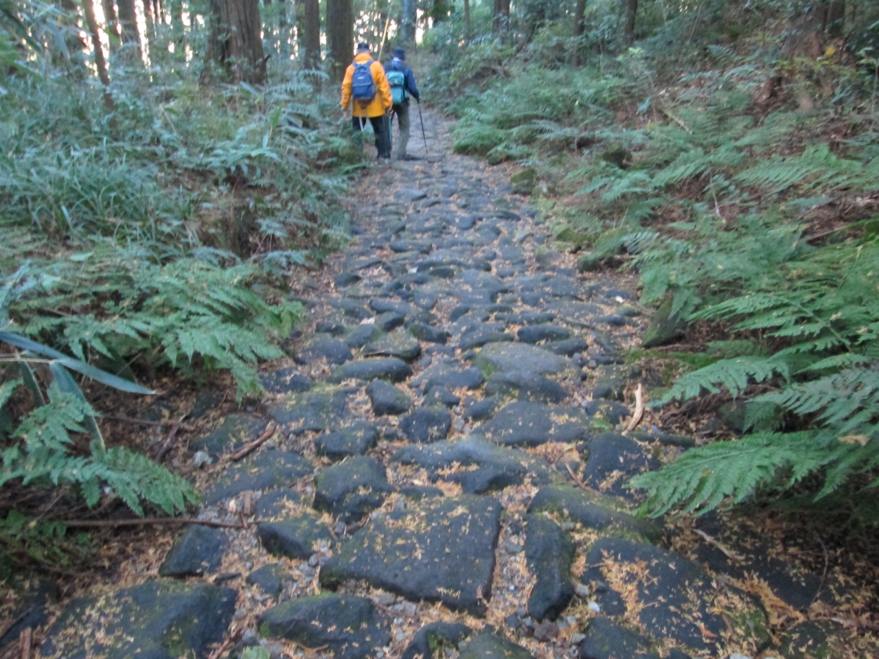 ここの石畳は江戸時代初期(十七世紀後半)、石畳施設当時の構造を今に伝えていて、国史跡に指定されています。きれいに見えますが、雨後に下ると、滑りやすいので慎重に下る必要があります。年季が経っているので石が丸さをおび、綺麗に見えます。石畳の構造の説明版によると、「底に小石を突き固め、その上に石を並べ、山側には土を、谷側には縦に排水路、更に石を積み土手を作りその上に植樹(並木)しています」とあります。十七世紀の道の反省を踏まえ、素晴らしい立派な街道を作ったことに感心しました