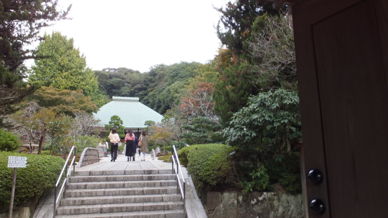 鎌倉駅前からバスでアクセスします。鎌倉五山の第5位のお寺です。入場尿100円を払い境内へ。きれいな石のお庭を通って本殿へ。銅で葺いた大きな屋根の建物です。広くはないので手軽に参拝できます。お茶室やガーデンテラスというイギリス風のレストランもあって、ちょっと珍しいです。