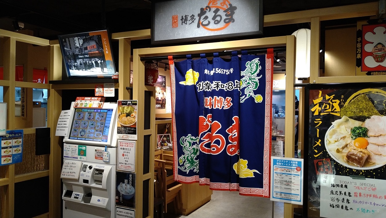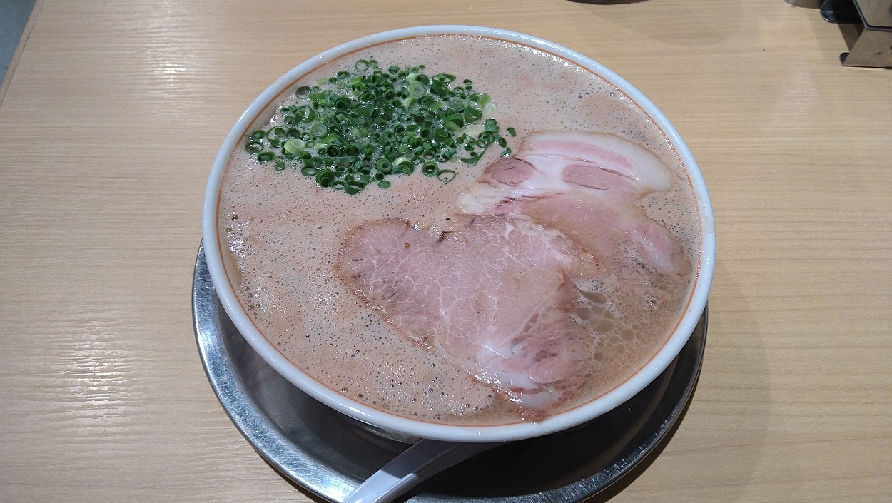 お台場の大型商業施設・アクアシティお台場5階の東京ラーメン国技館舞にある博多ラーメン店です。夕食でラーメン790円をいただきました。具はチャーシュー2枚とネギで、極細ストレート麺と、かなり濃厚な豚骨スープの一品です。スープが丼からあふれそうになるほど入っていて、麺が見えない状態。塩分が強めでしたが、豚骨の旨味とコクのあるスープで美味しかったです。