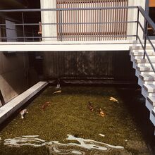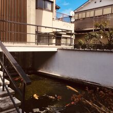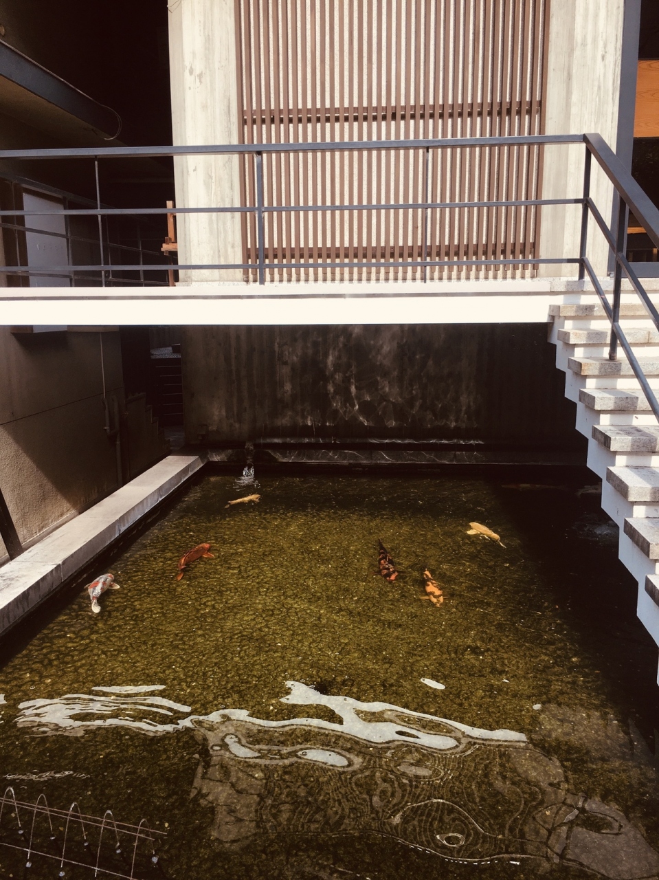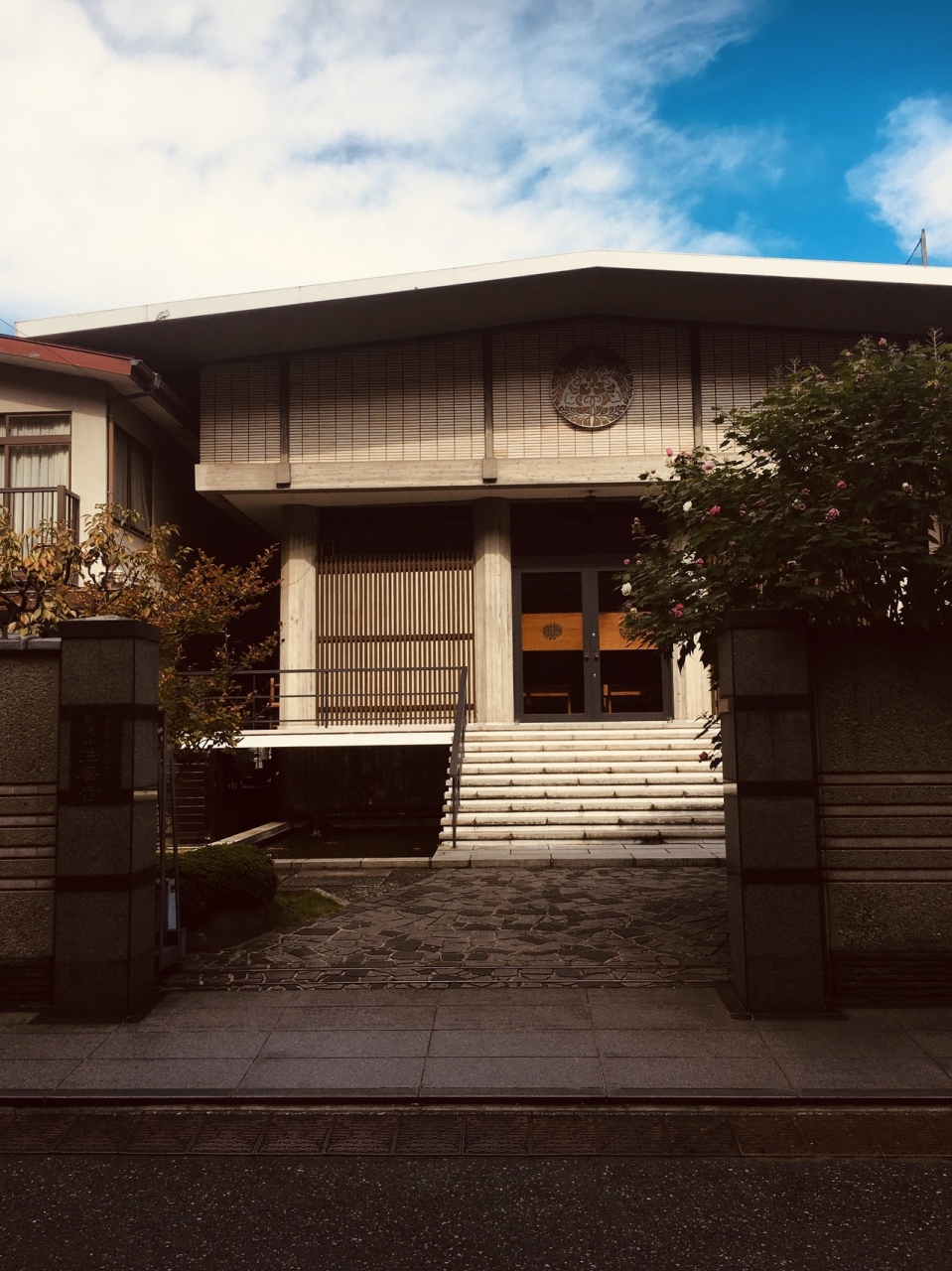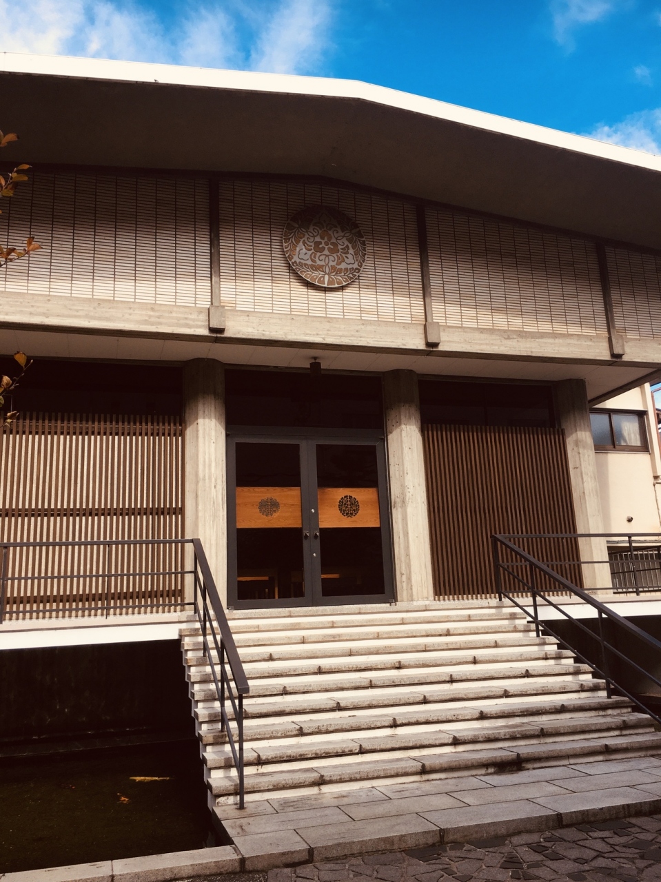 境内に入ると直ぐにモダンな感じの本堂があり少し上を見ると家紋のようなものがありました。階段を上がって建物内に行くこととなりますが、階段の下、左右には池があり鯉が泳ぎ良い感じでした。隣には寺の務所があります。