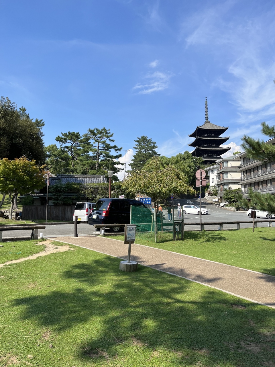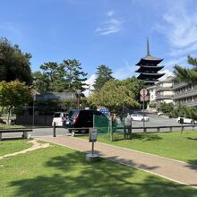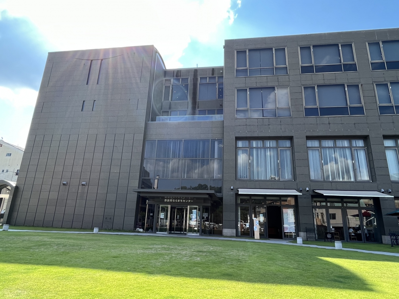 ならまち散策中に立ち寄りました。猿沢池の近くです。図書館やホールなどが入る大きな複合施設で、一階にはカフェも入っていました。広い芝生の広場もあって明るい雰囲気でした。広場からは、ちょうど興福寺の五重塔が見えます。