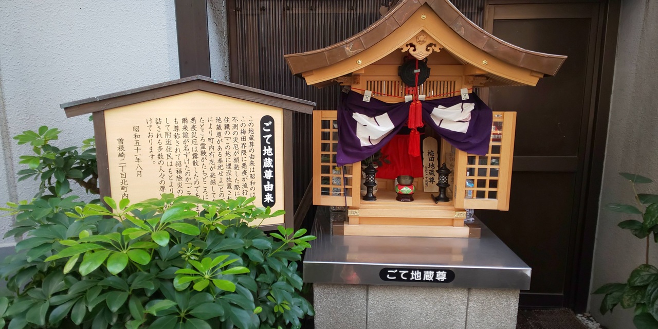 昭和初期に梅田付近で悪疫が流行った際にこちらにお地蔵さまをおまつりしたところ、この悪疫がしずまったと言われています。