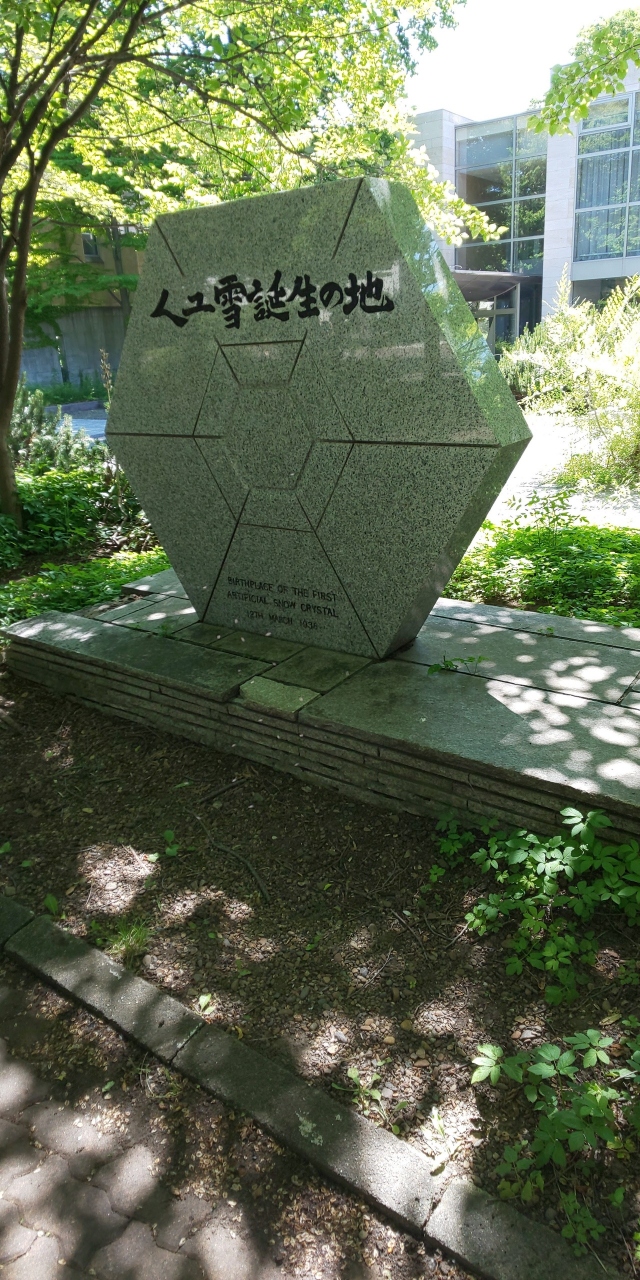 昭和11年に中谷宇吉郎博士が北海道大学の常時低温研究室において人工雪をつくることに成功しました。世界初ということで、石碑がキャンパス内にあります。
