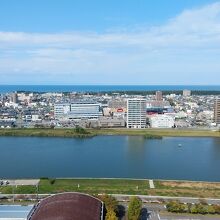 展望フロアは地上約67メートルで、日本海や信濃川の眺望がすばらしい。市街地の広がりも見られ、高層ビルであるネクスト21や朱鷺メッセなどの建物もはっきりととらえることができた。