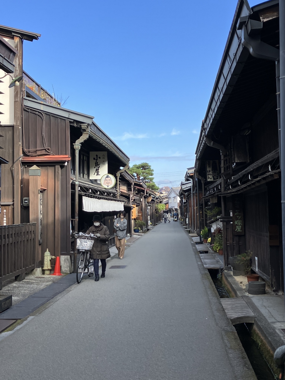 朝市の帰りに古い街並みを通りました。道の両側に覆いの無い溝が有って、黒く塗られた木造作りで、格子戸が続いている現在も普通に暮らしている場所です。イタリア人の団体観光客が大声を出しながら散策しているのを見ると複雑です。