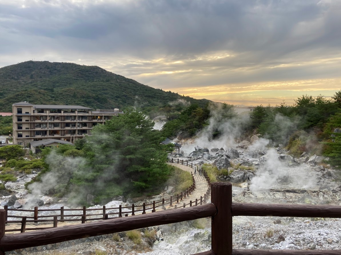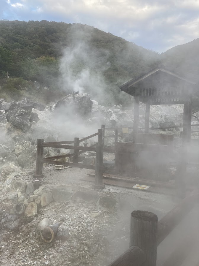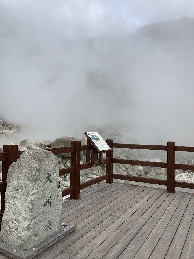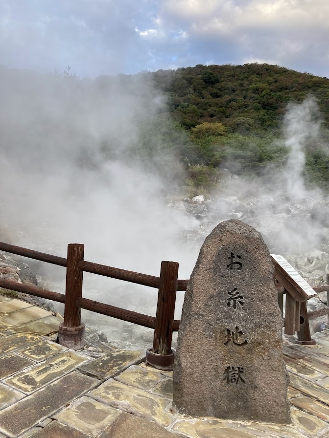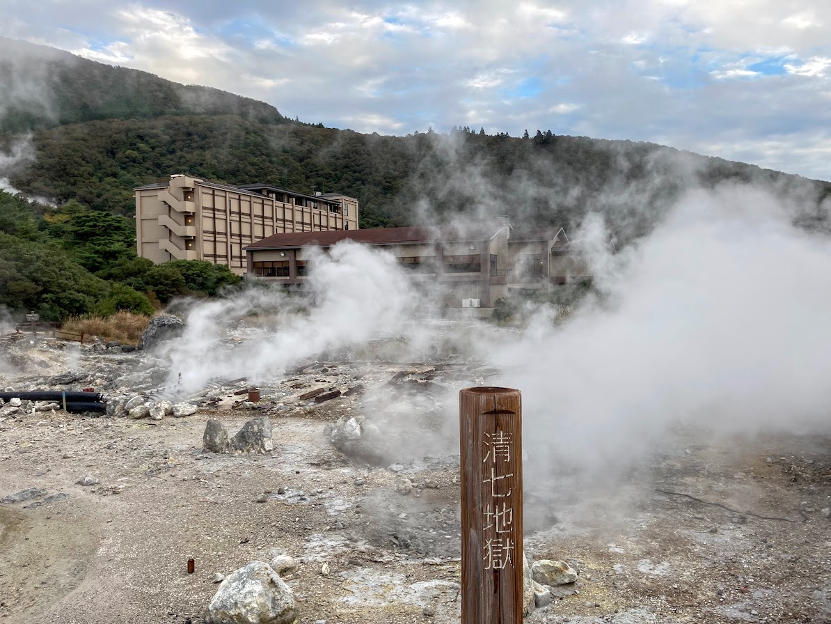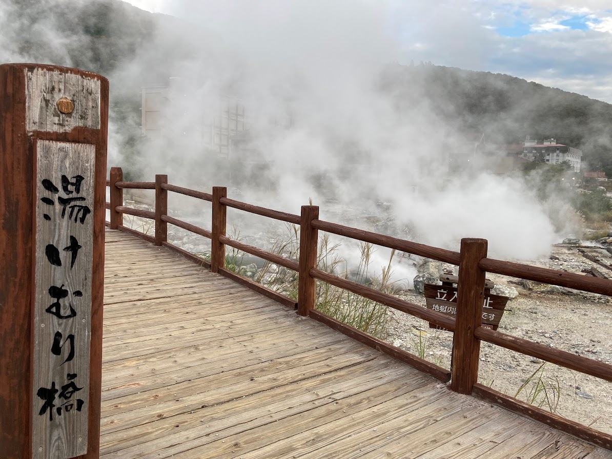 別府の海地獄を観光した後でしたので、比べると、こちらの方が自然のパワーを感じました。硫黄の香りが立ち込め、湯煙で前が見えないくらいで「大叫喚地獄」が一番真っ白でした。いろんな名前の付いた地獄が30くらいあります。