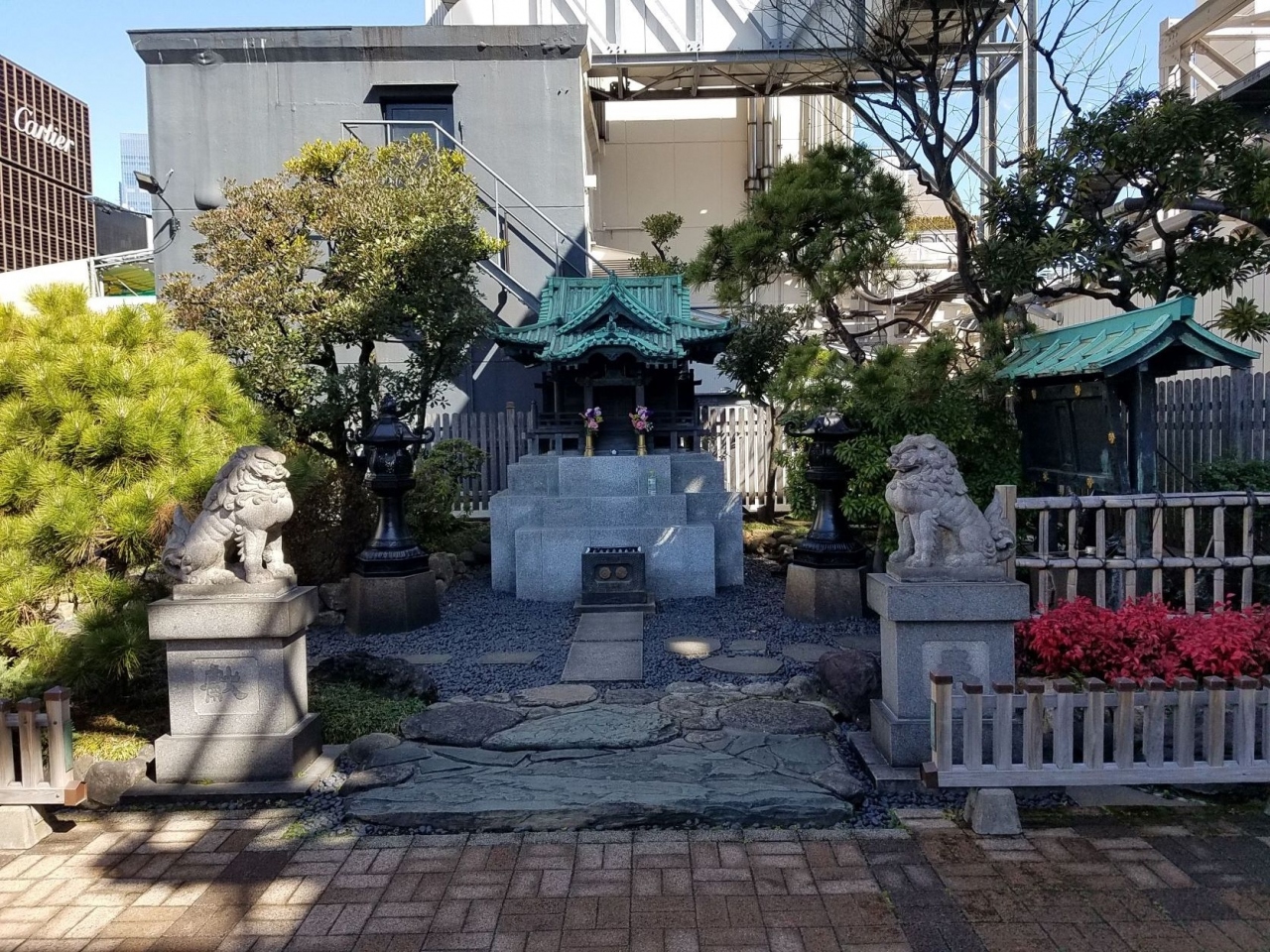 松屋銀座の屋上にあります。たまに神社などが屋上にあるのを見かけますが大抵は祠が単体であるだけみたいな印象ですがこちらは狛犬もいれば手水舎もあり樹木も多くてちょっとした林みたいになっていたりと見所が多いです。小さいながらお堂の屋根の造形に重厚感がありますね。
