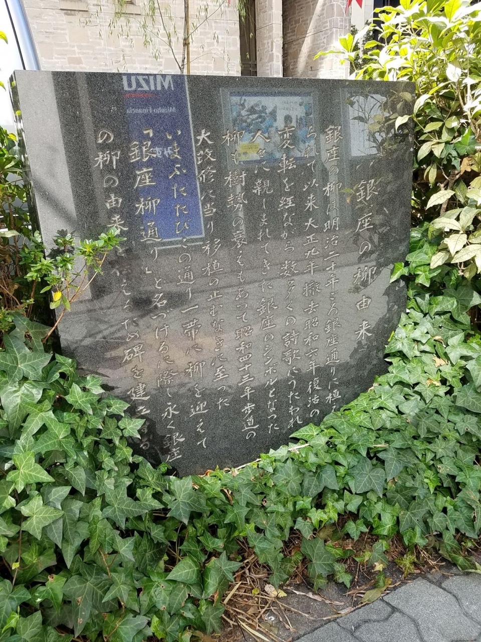 銀座中央通りと銀座柳通りの交差点の近くにありました。以前、銀座柳通りを歩いた時に非常に雰囲気があったのでどんな歴史があるのだろうと興味がありましたが明治時代に植えられて大正時代には一度撤去されているのですね。碑は黒くて目立たないし歩道でしゃがまないと読みづらいのが残念です。