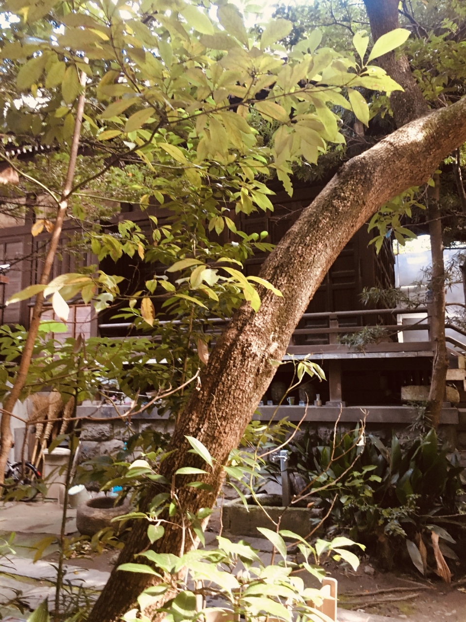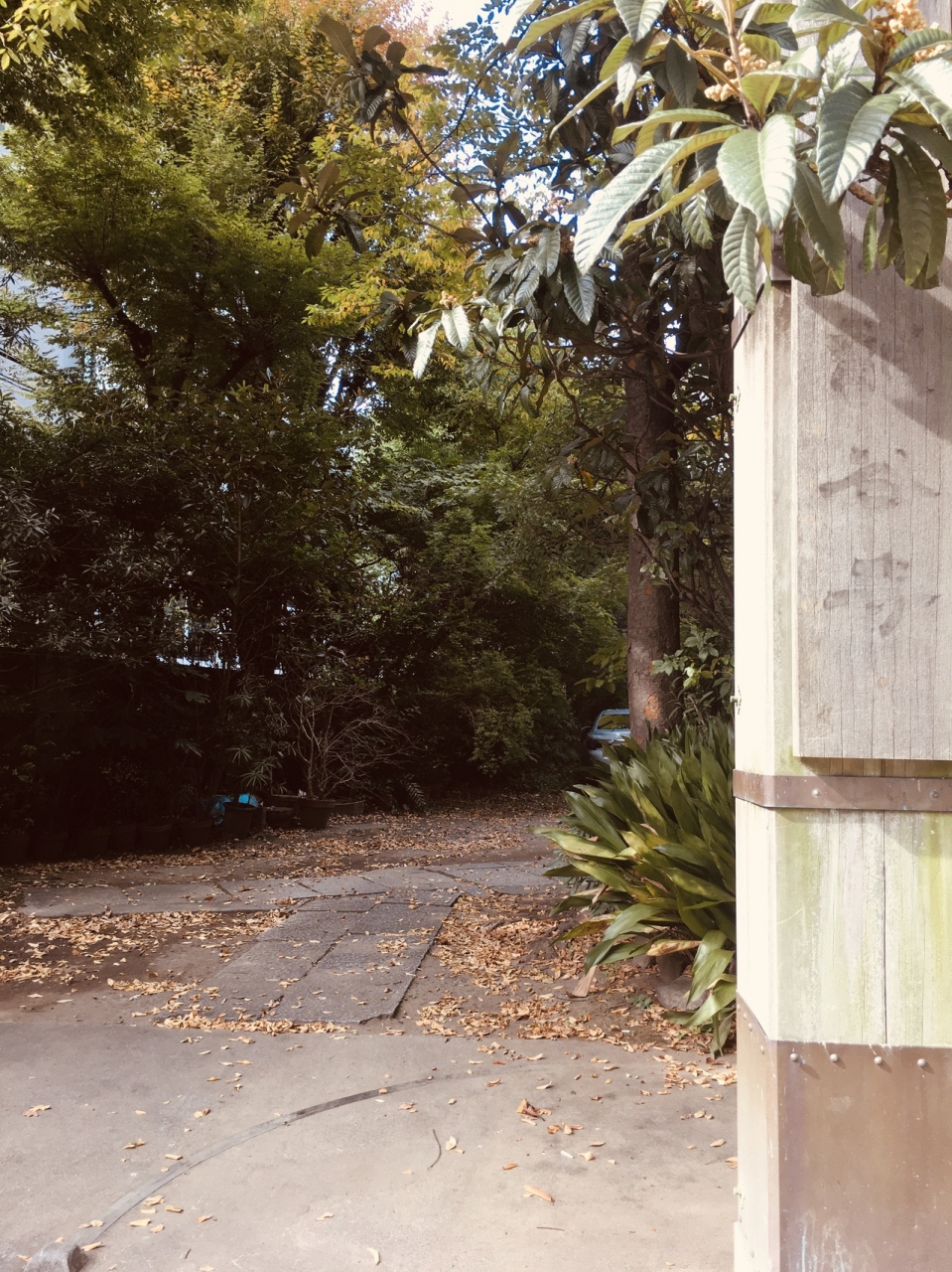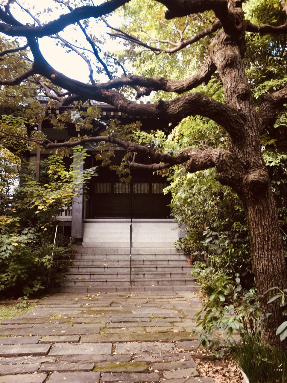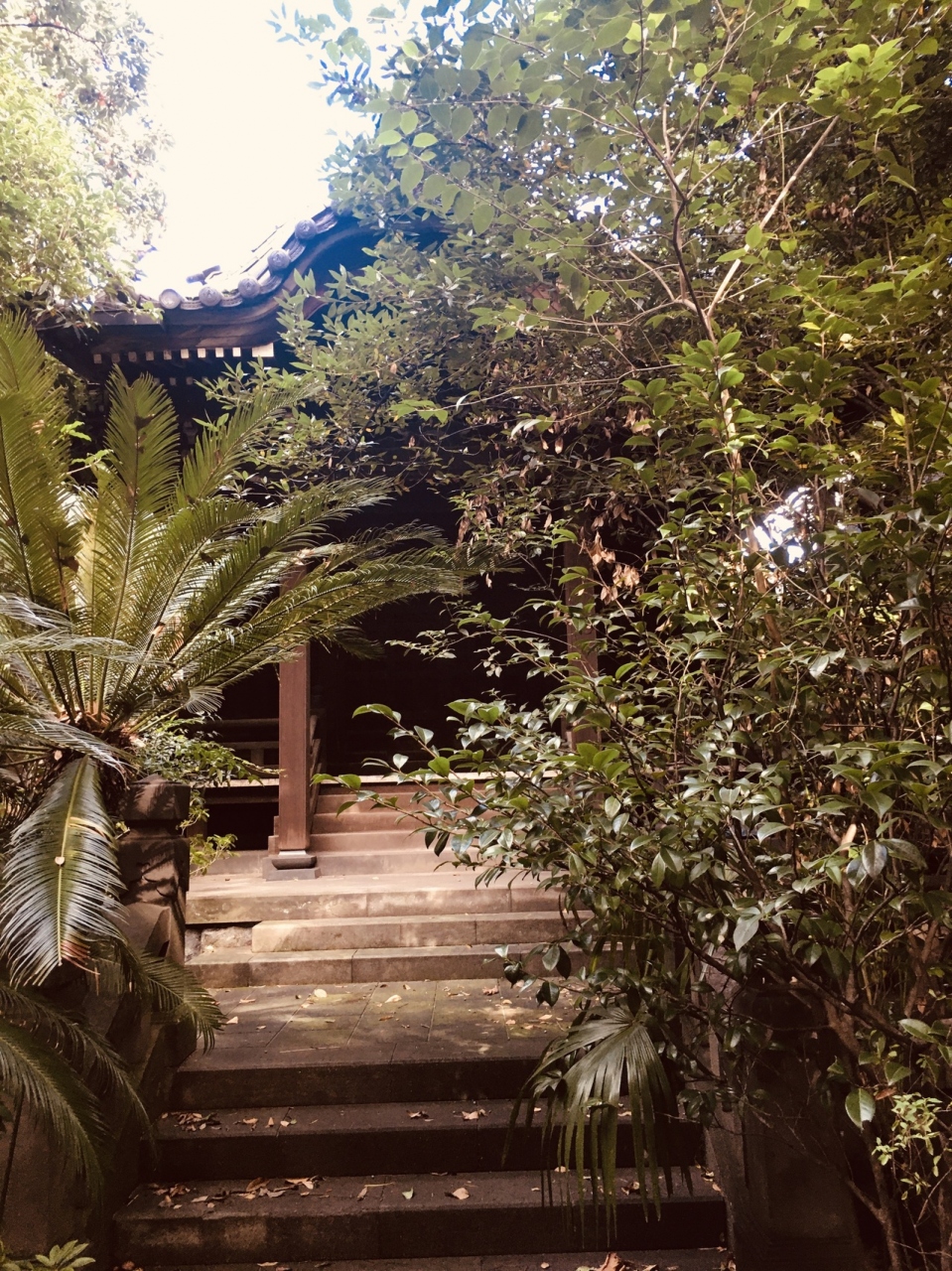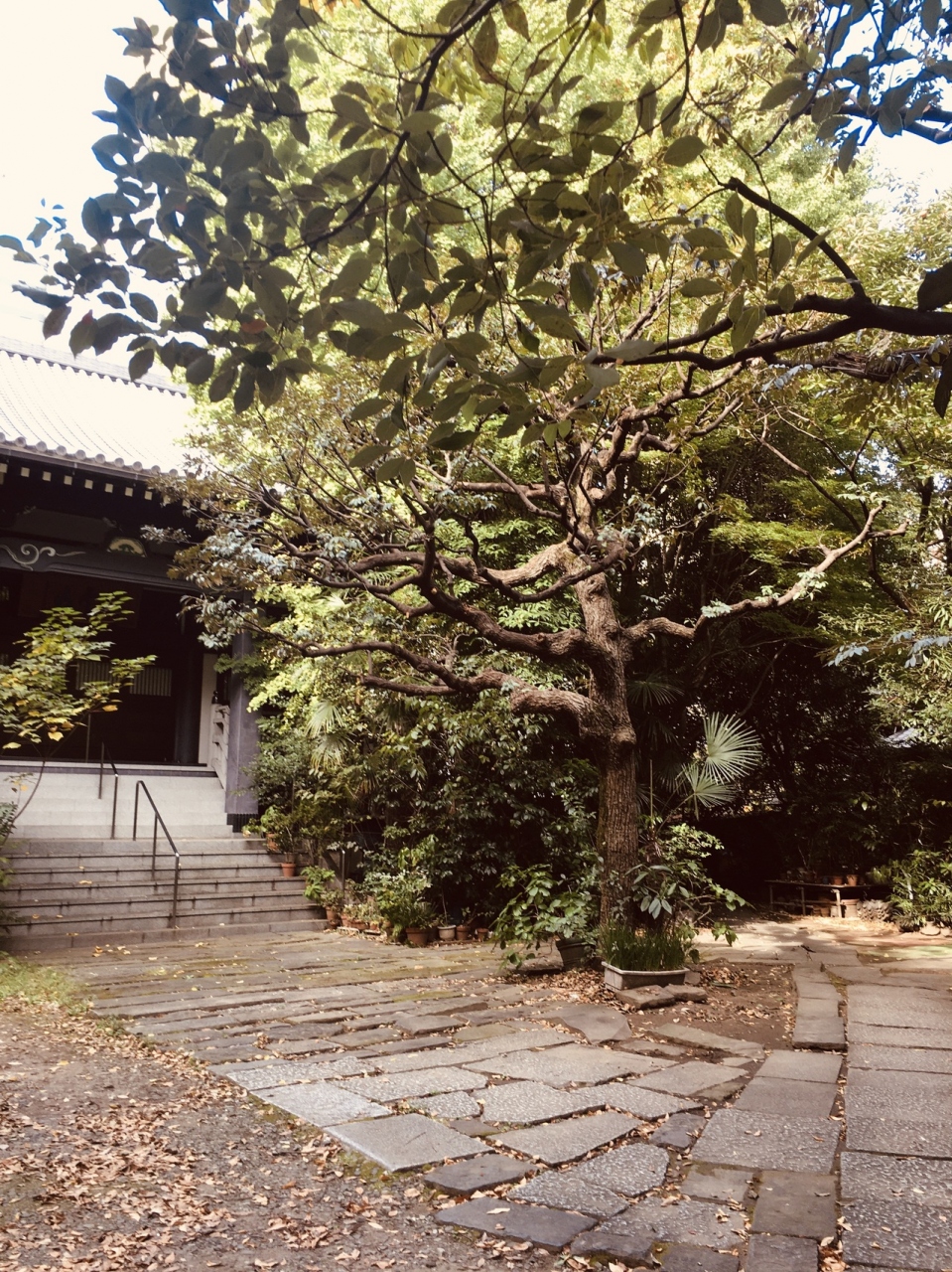 境内入ると石の道が伸びていて、高い木に囲まれているような境内で、日があまり当たらないような雰囲気で、落ち葉もたくさん落ちていました。本堂は大きく木に隠れるように建っていて、裏側には庭のような場所もありました。