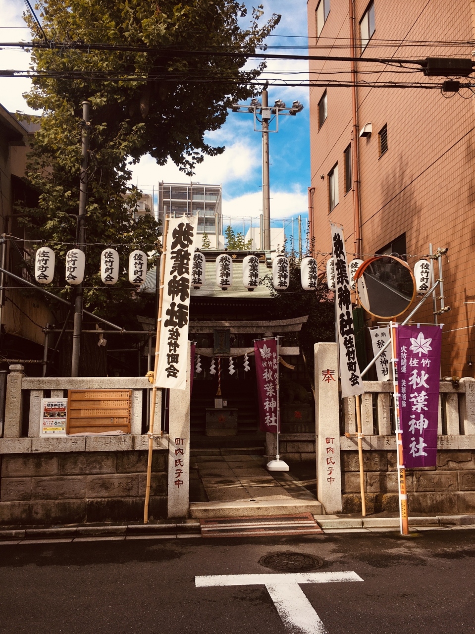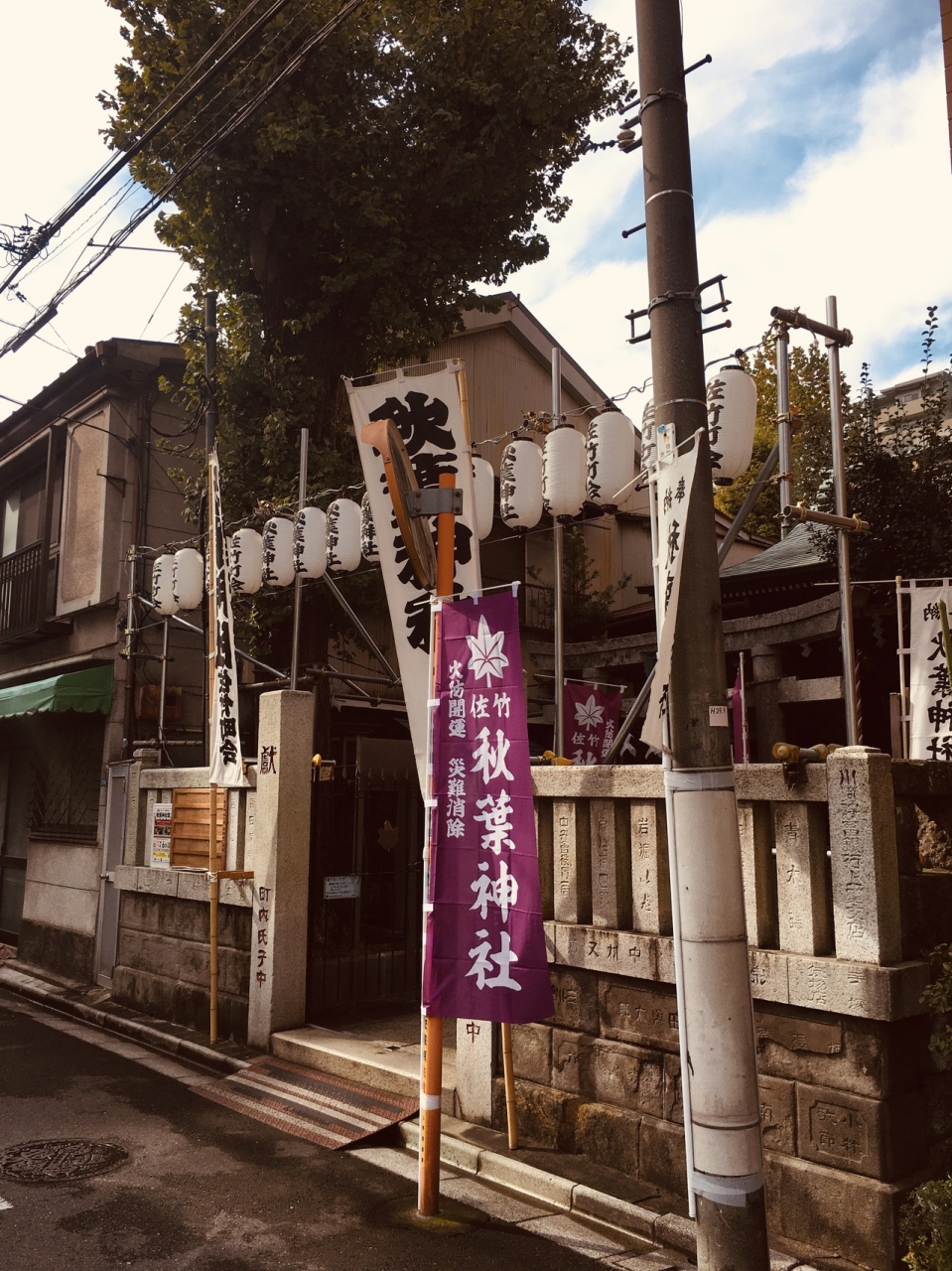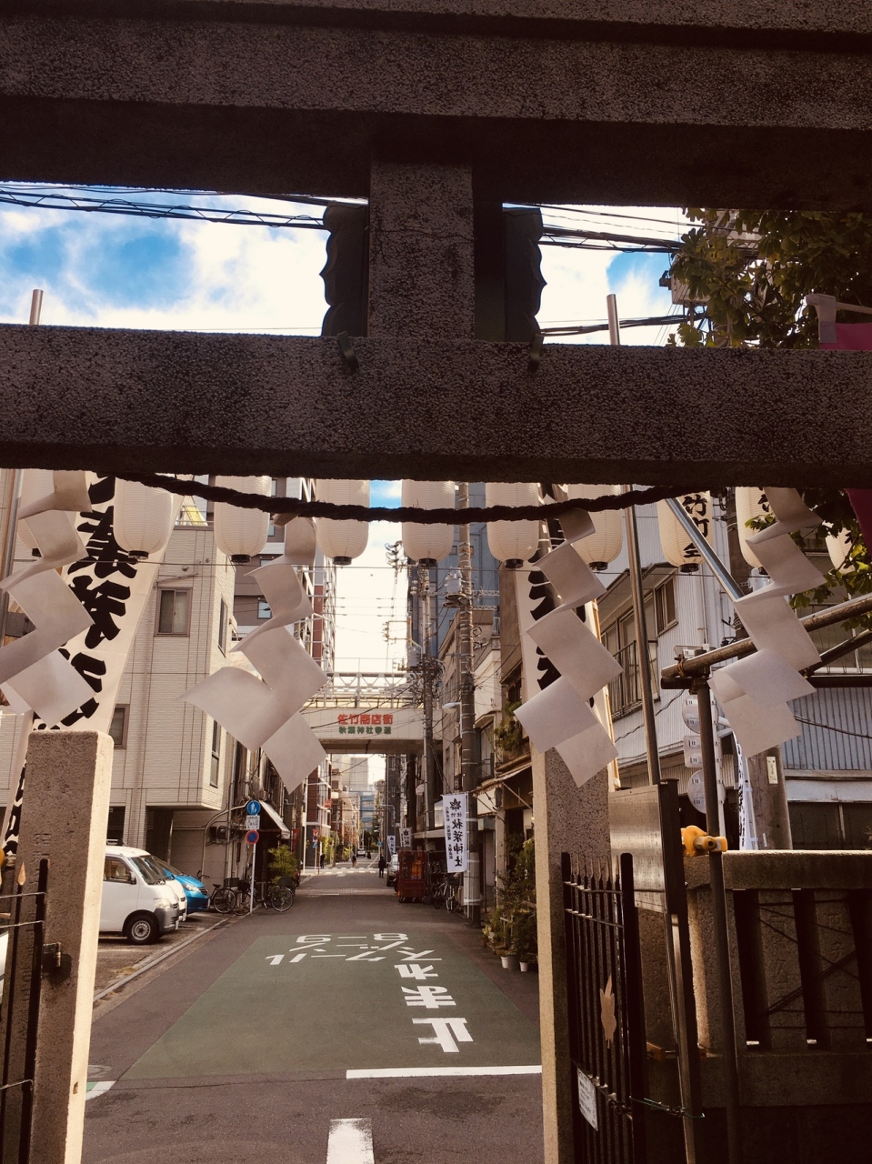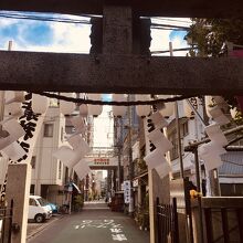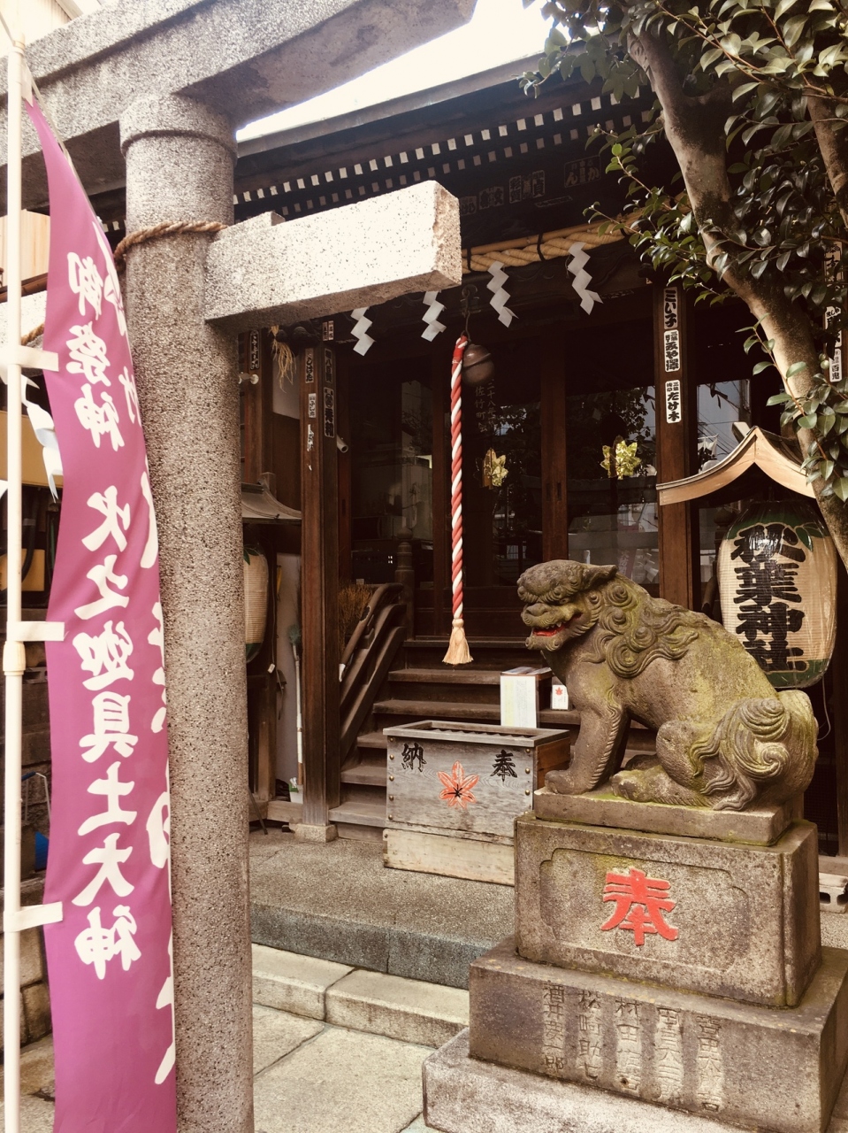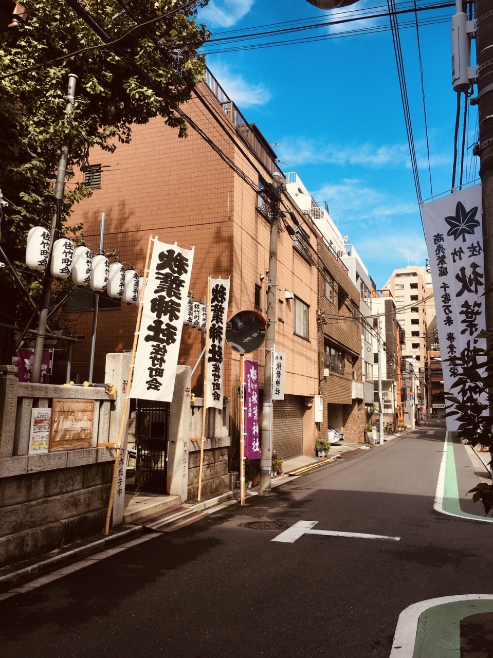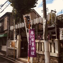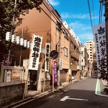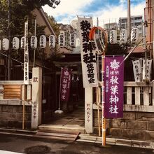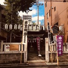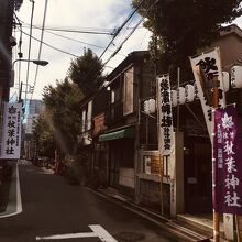 路地裏を歩いていると白と紫の幟がいくつか見えました。左右には建物が建っているため少し圧迫されたような外観で、白い提灯がいくつかぶら下がった後方には鳥居、社殿があり年季入った獅子の像があります。小さな神社です。