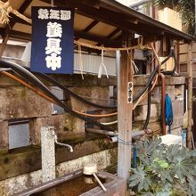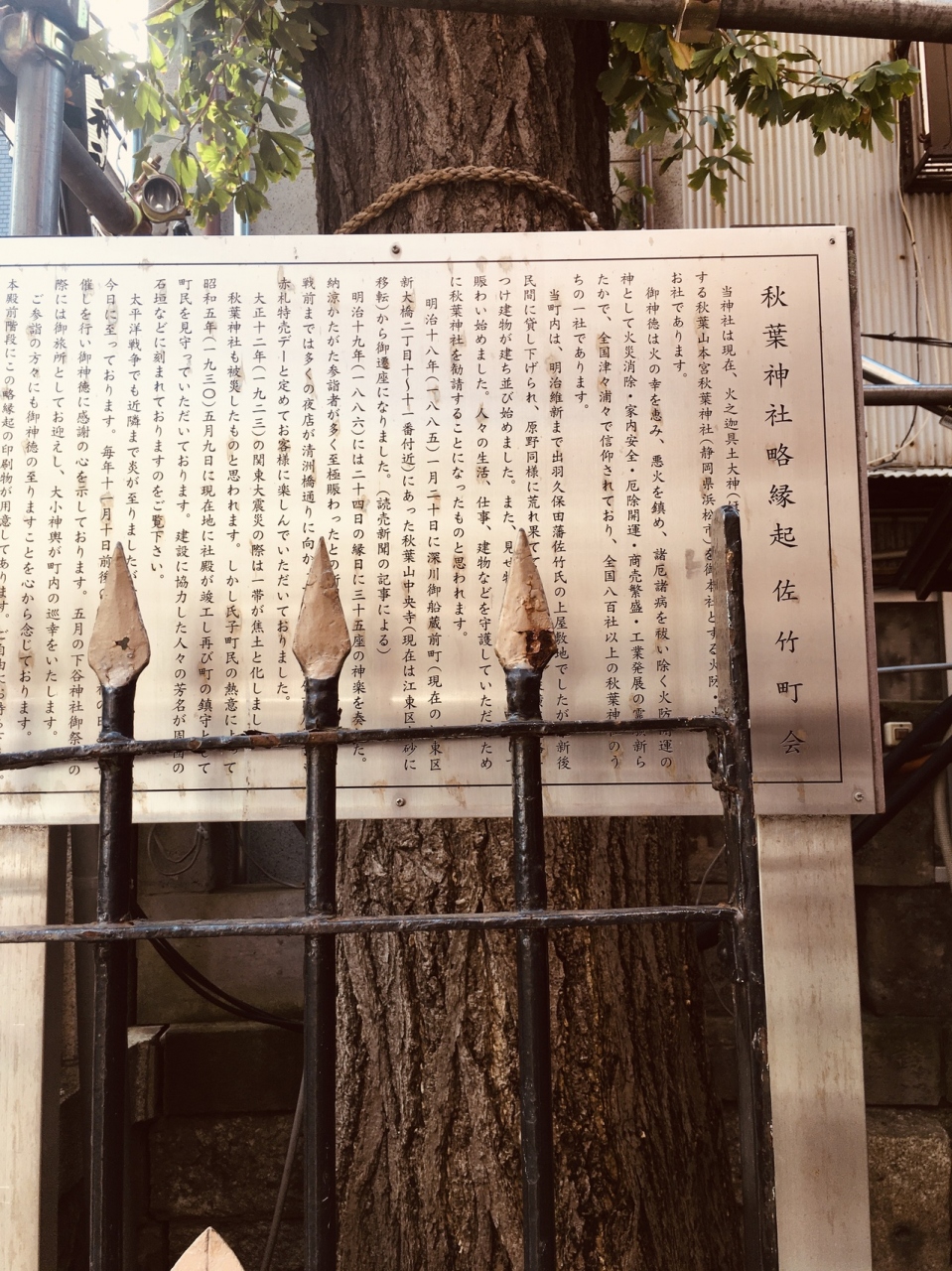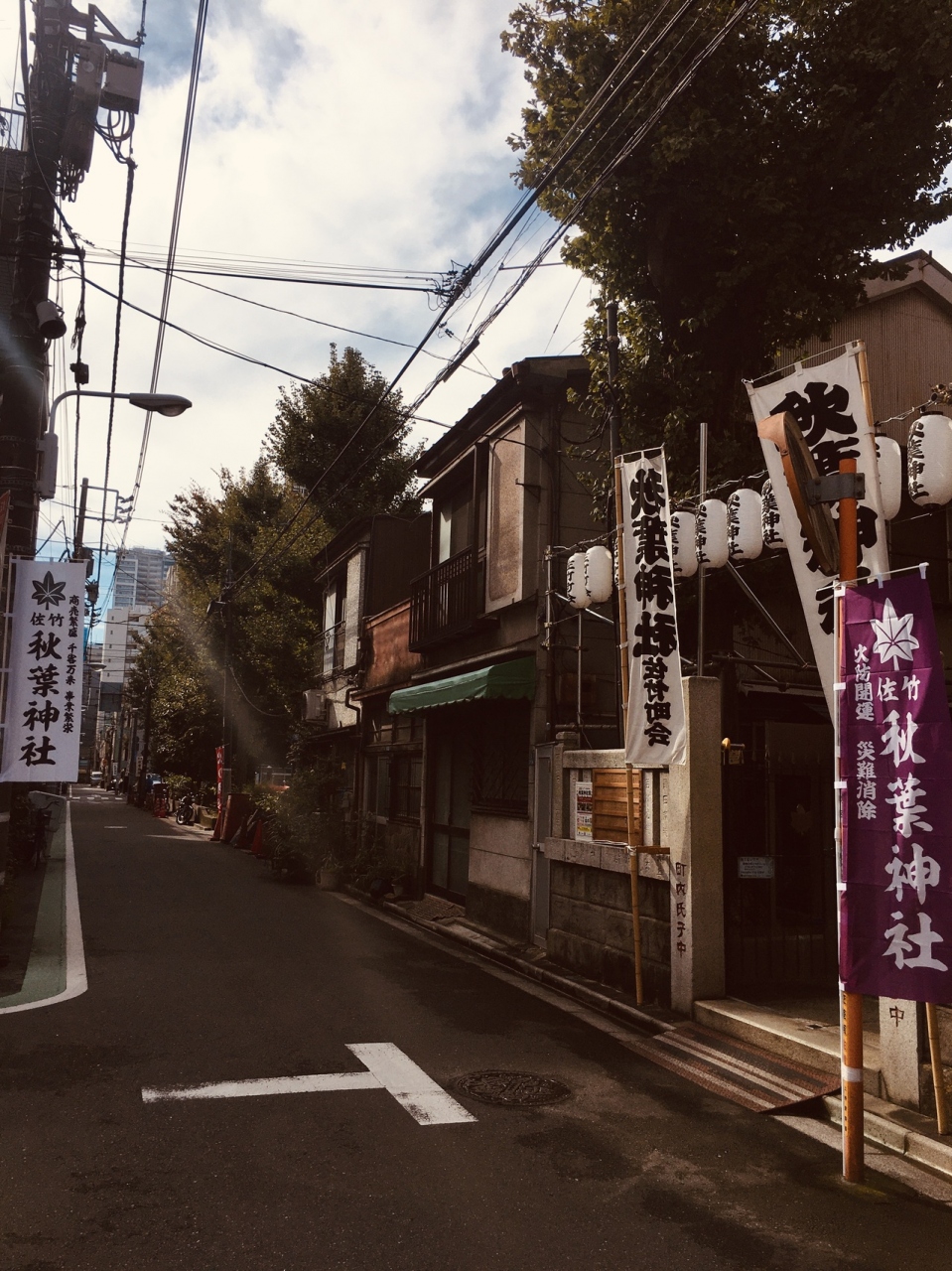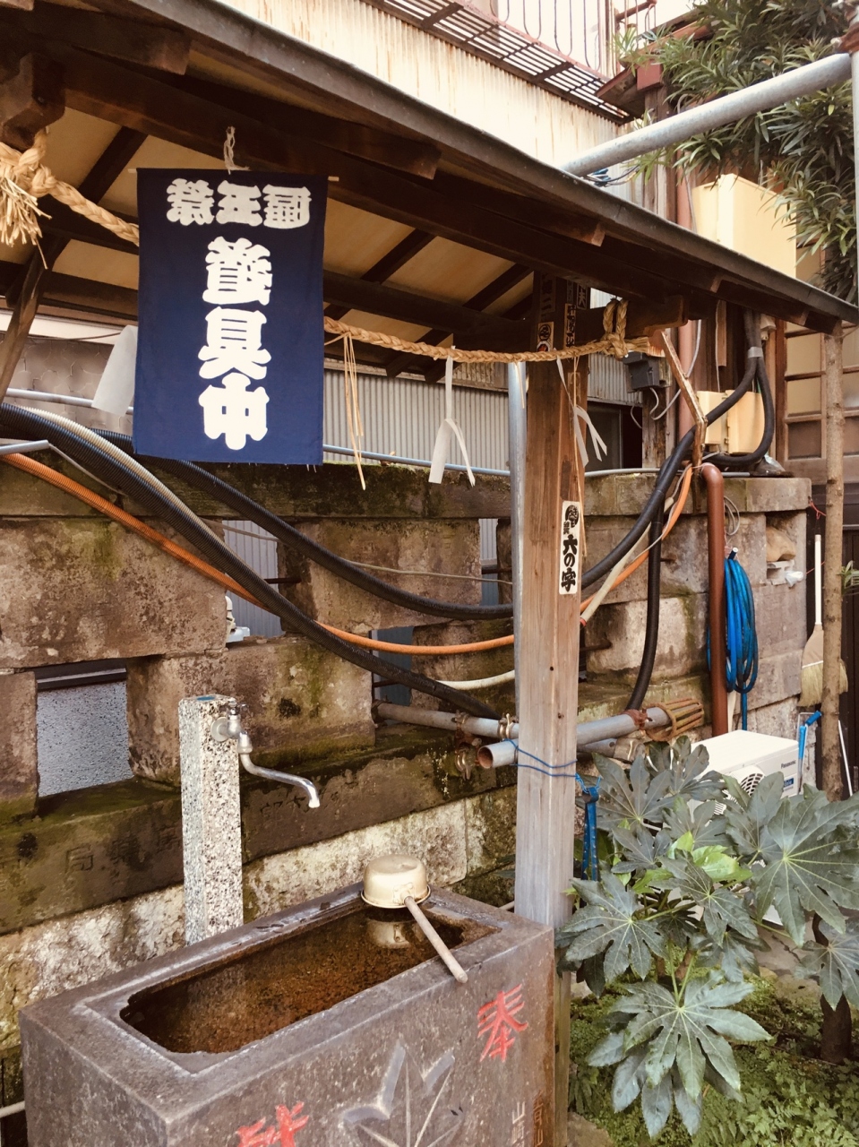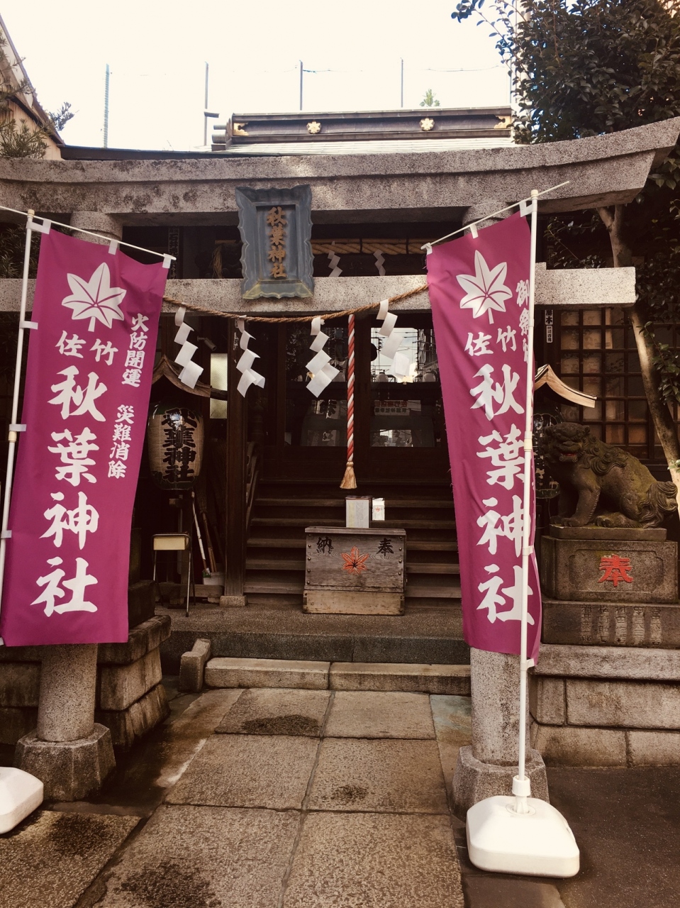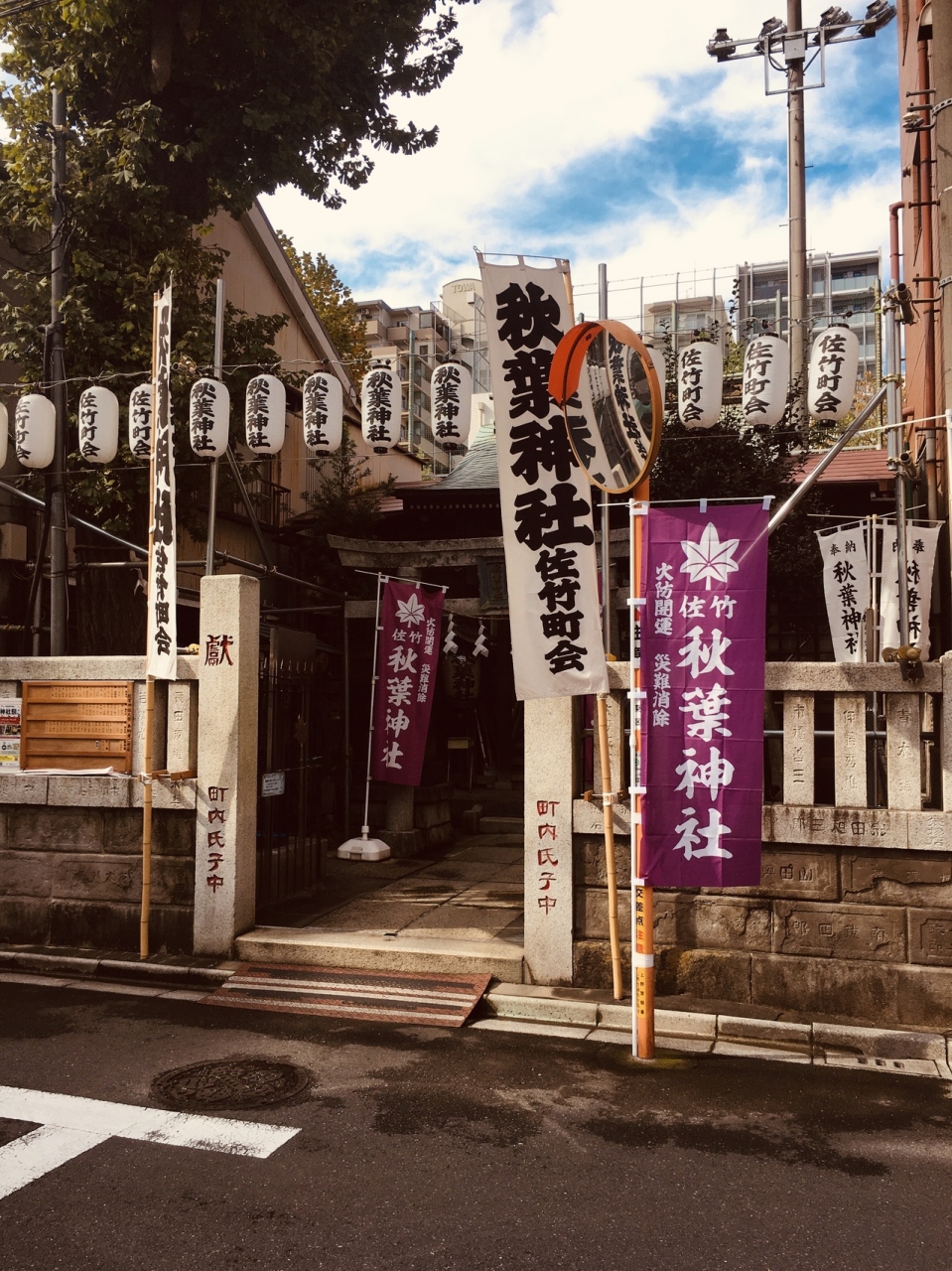 路地裏を歩いていると白と紫の幟がいくつか見えました。左右には建物が建っているため少し圧迫されたような外観で、白い提灯がいくつかぶら下がった後方には鳥居、社殿があり年季入った獅子の像があります。小さな神社です。