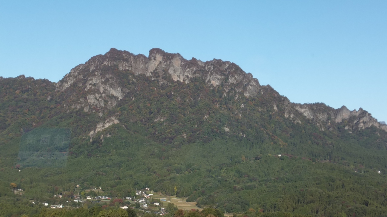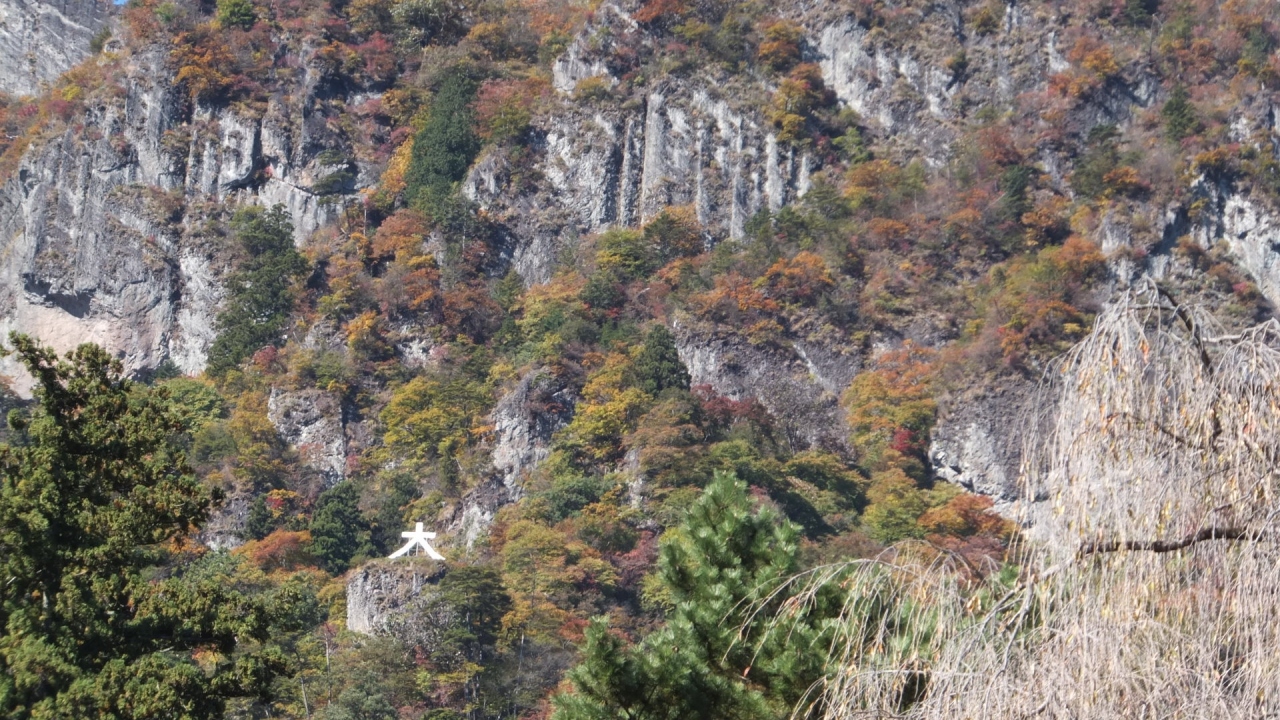 群馬の観光で訪問しました。山はホテルからもよく見えましたし、神社に行ったので、そこからもよく見えました。日本三大奇景と呼ばれる場所で、とても不思議な形の特徴的な山なので目立ちます。山の途中の「大」の字も見えました。紅葉時期できれいでした。