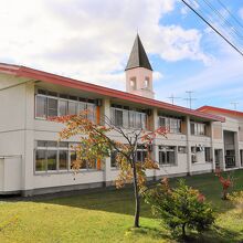 「三角屋根のある塔」が素敵な建物、敷地内は立入禁止のため離れた場所から撮影するとよいでしょう。