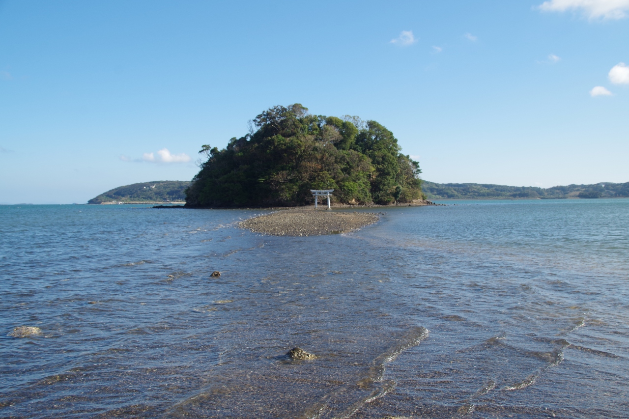干潮時には砂州で繋がった陸繋島(りくけいとう)となり、満潮時には離島となります。