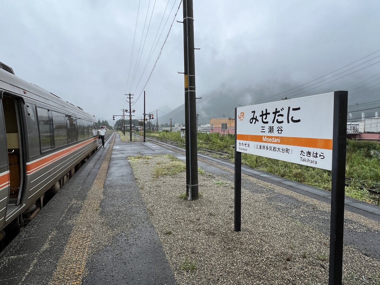 特急南紀を利用して、三瀬谷駅で下車しました。特急も停車する駅ですが無人駅です。下り(新宮方面)ホームに到着すると、跨線橋を使わないと改札まで行けません。ホームを含めて屋根がないので、当日は雨で大変でした。