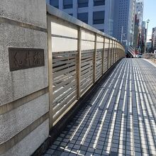 片側の側面が築地川亀井橋公園に接している橋です。反対側は背の高い欄干があって閉鎖的な感じで全体的に見て橋っぽくないですね。欄干が横格子状になっていて隙間から橋の下の景色が見えるのですが川ではなく首都高ですね。