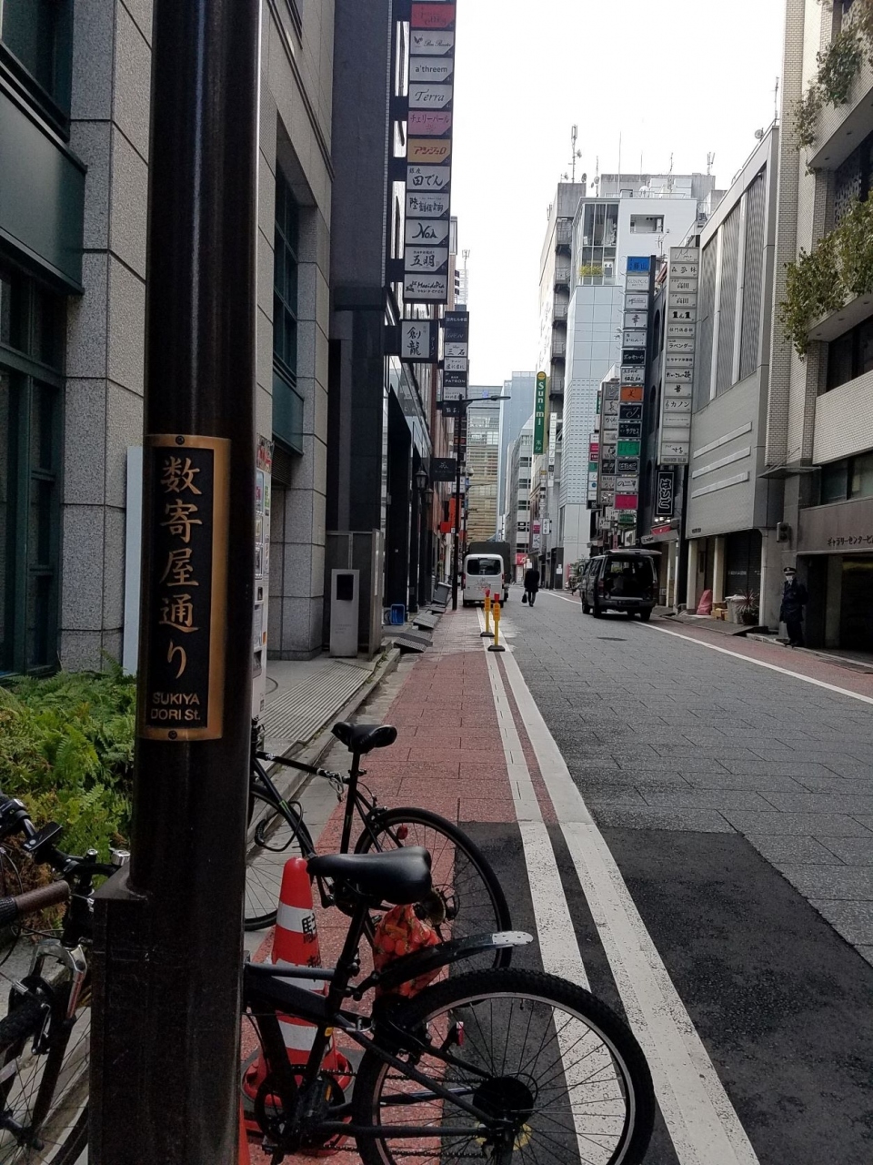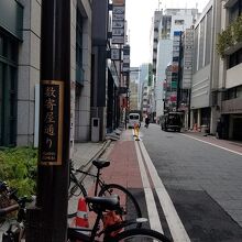 泰明通りから一本東にある通りです。泰明通りは泰明小学校止まりですが数寄屋通りは泰明小学校の横を通って数寄屋橋公園まで行けますね。刑事もののドラマに映るバーやクラブかなにかの縦に連なる看板が見えていてある意味、銀座っぽい光景を見た気がしました。