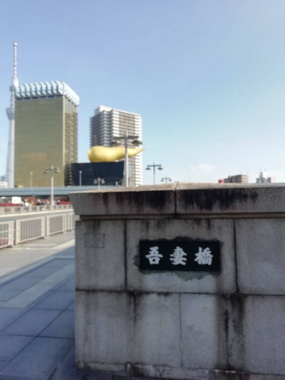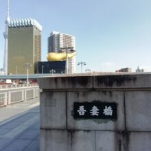 隅田川にはいろいろな橋がかかっていますが、こちからの眺めは抜群です。スカイツリー、アサヒビールビル、川に浮かぶ船とこの赤い橋はなかなか印象的です。ここから川沿いに散歩道が続いています。ときおり船が通るのも楽しめます。