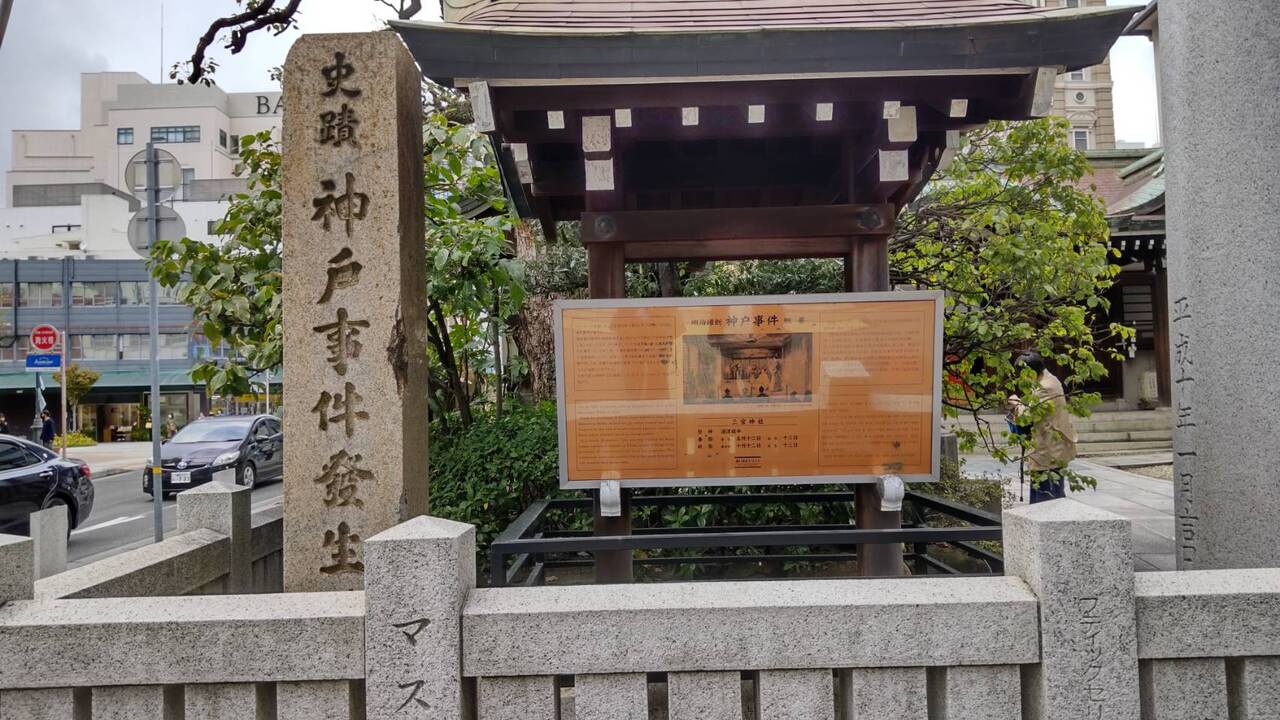 神戸事件発祥の地碑は、三宮神社の境内にあります。石碑、説明板、当時の大砲があります。神戸事件は、1868年2月4日に三宮神社前において備前藩兵が隊列を横切ったフランス水兵らを負傷させ、銃撃戦に発展し、居留地を検分中の欧米諸公使らに水平射撃を加えた事件で、明治政府初の外交問題となったものです。隊の責任者が切腹することで解決し、外国人に切腹を深く印象付けることとなった事件の1つとのことです。