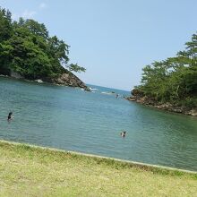 城山公園の無料の駐車場に車を止めました。目の前には城山公園とぽっかりと穴があいた明鏡洞。右手には綺麗な砂浜の城山海水浴場が続きます。明鏡洞あたりの海は透明でとても綺麗でした。