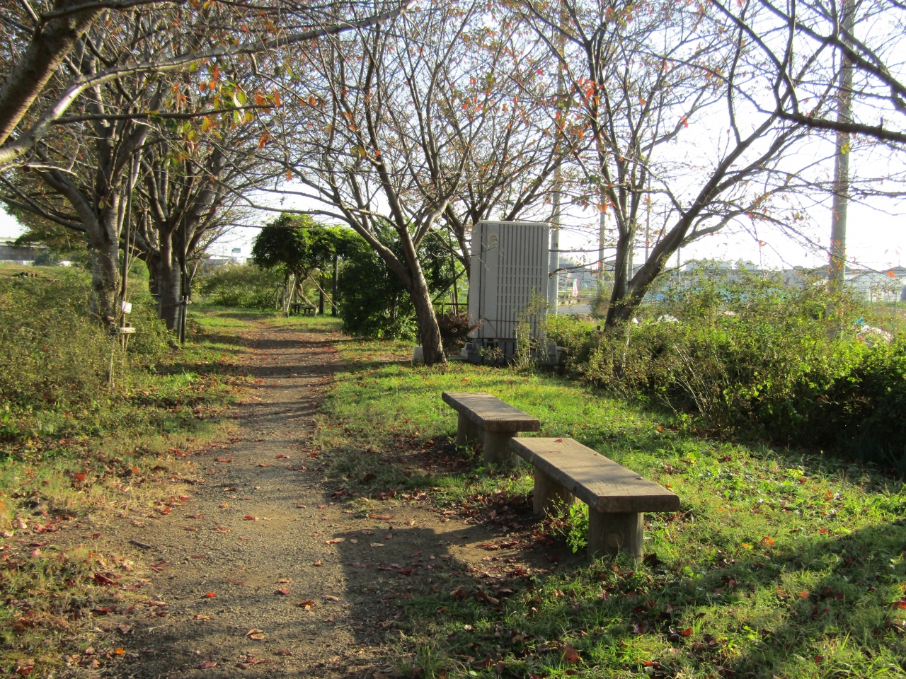 この萩園橋上流の桜並木には休憩場所は設置されているgふぁ、トイレが設置されていない。