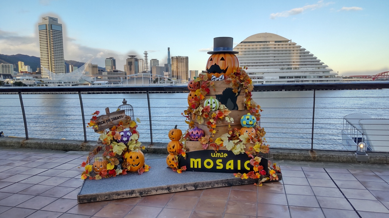 umie MOSAICは、神戸ハーバーランドの東側、神戸港のウォーターフロンに面している商業施設です。10月末に訪問したところハロウィン装飾ジャック・オー・ランタンがありました。数人の家族ずれが記念写真を撮っていました。素敵な写真のスポットです。