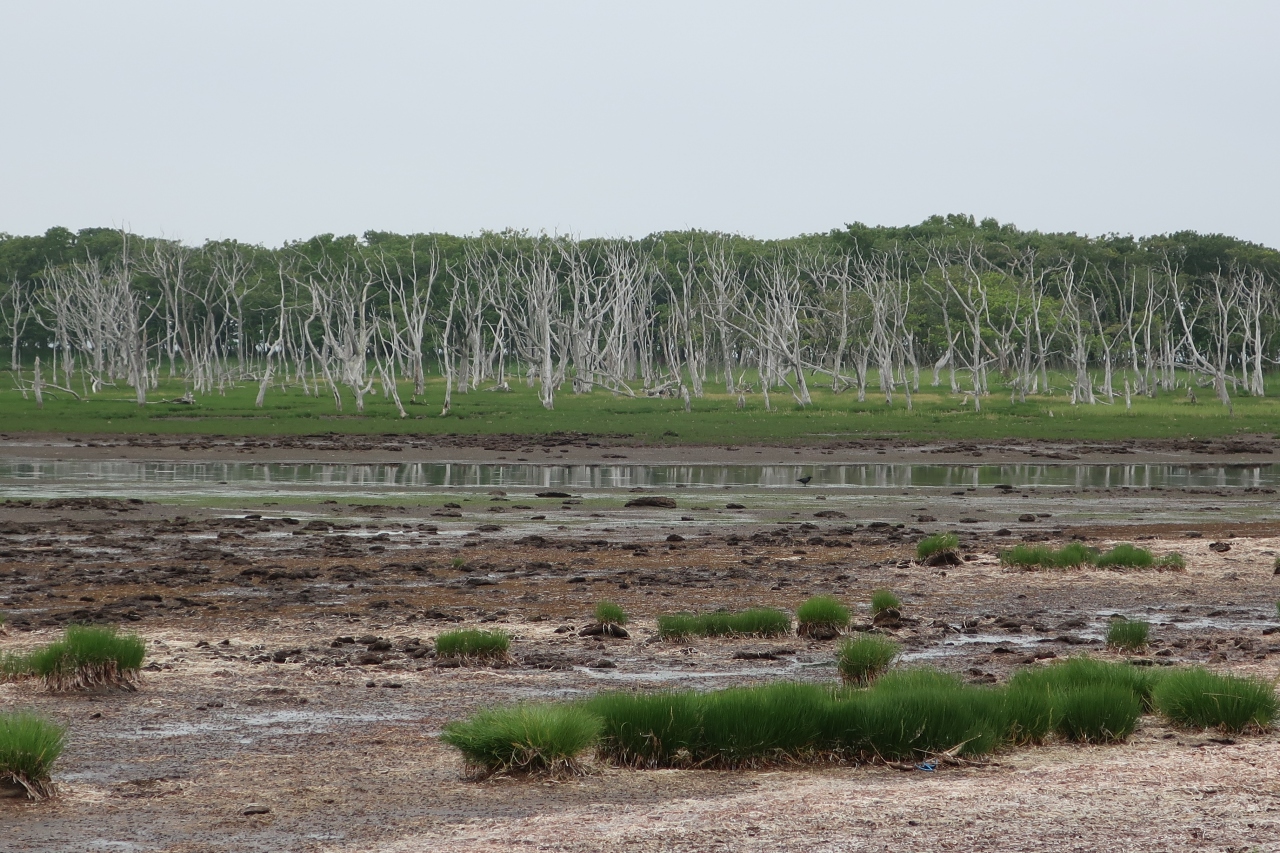 野付半島ネイチャーセンターに向かう途中にあります。トドワラよりまだたくさんミズナラが残っていて、こちらの方が墨絵のようで、じっと見ていると独特の世界観があります。駐車場に椅子を並べてしばらく見入っていました。
