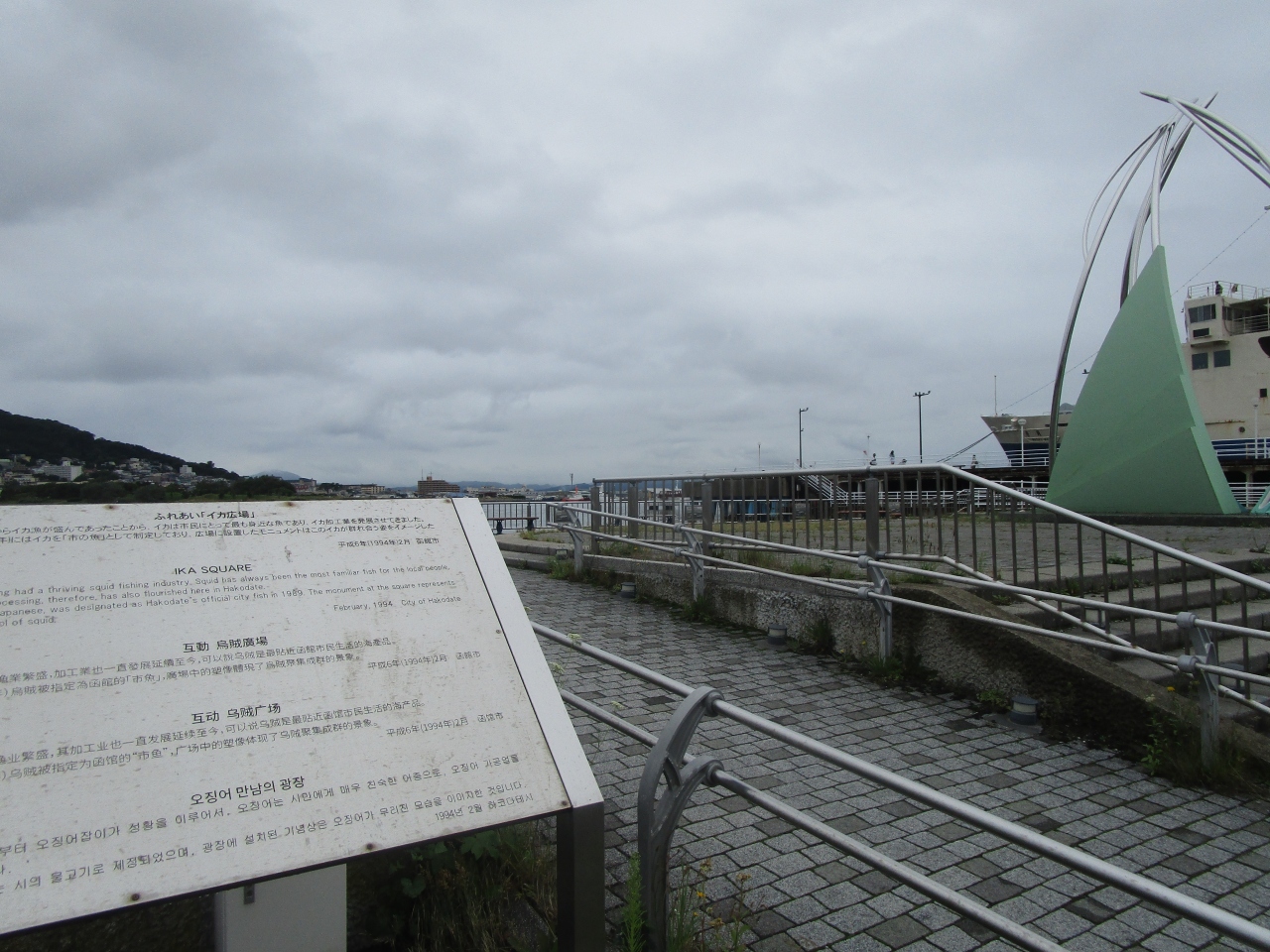 JRの函館駅から函館朝市を通って行った場所にあります。イカは函館市の魚ということで、イカをモチーフにしたモニュメントなどがあります。広い広場もあり、近くに係留されている青函連絡船記念館摩周丸を眺めながらのんびりとすることができました。