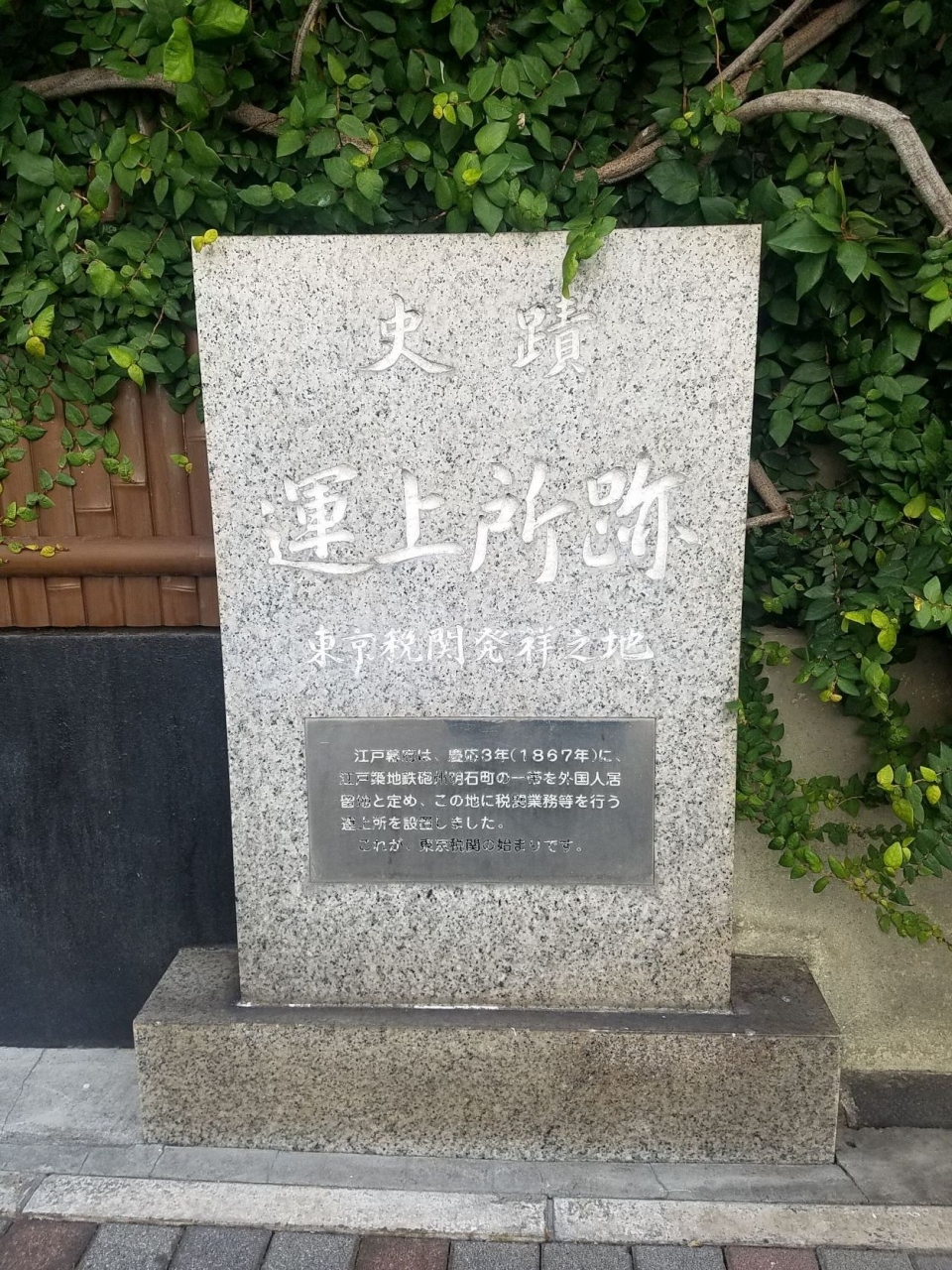 電信創業之地から隅田川の方に進んだ通りの高級そうな料亭の前にありました。運上所というのは神奈川運上所跡を見た時に知ったのですが税関のことですね。ここに東京税関の前身があったということですが電信創業之地といい横浜と築地は縁がある気がしました。