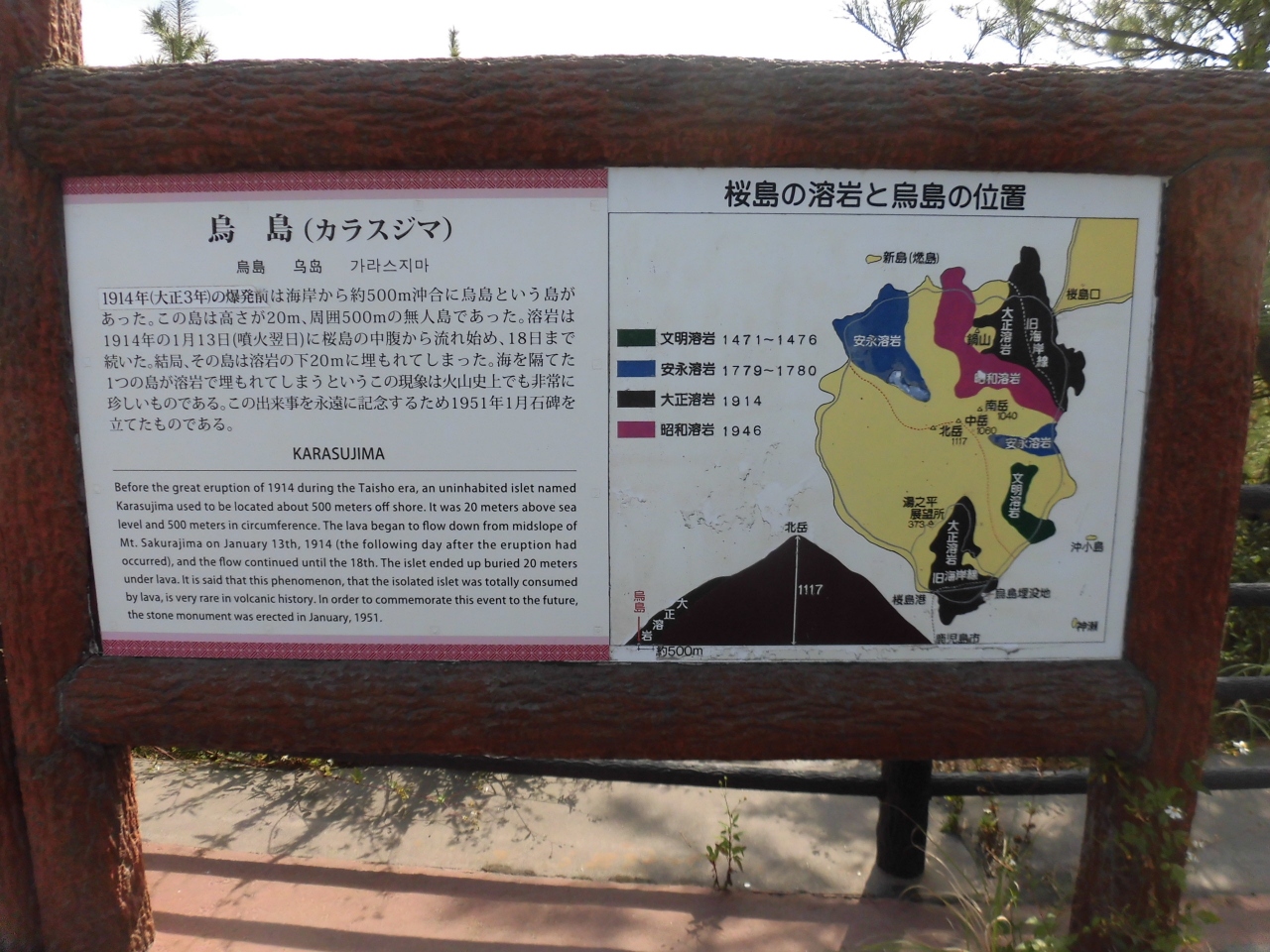 1475年の桜島の噴火によってできた島に、烏がたくさん生息していたので烏島と呼ばれるようになったそうですが、1914年の噴火で溶岩に埋まってしまったとのことで、「烏島この下に」の記念碑が建っています。
