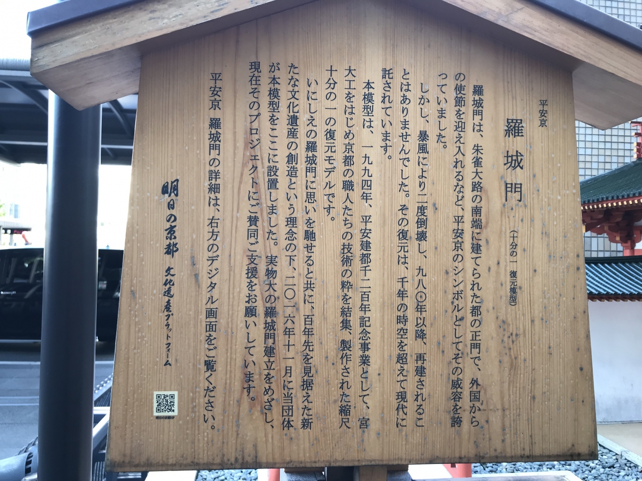 羅城門跡は、九条通から少し入った公園の中に石碑だけが残っています。羅城門は平安京の南の正面入口の門になります。しかしJR京都駅中央口前には実際の十分の一の大きさの復元された模型門があります。平安遷都1200年記念事業として、宮大工たち職人の技術が結集されているので羅城門跡よりもおすすめです。