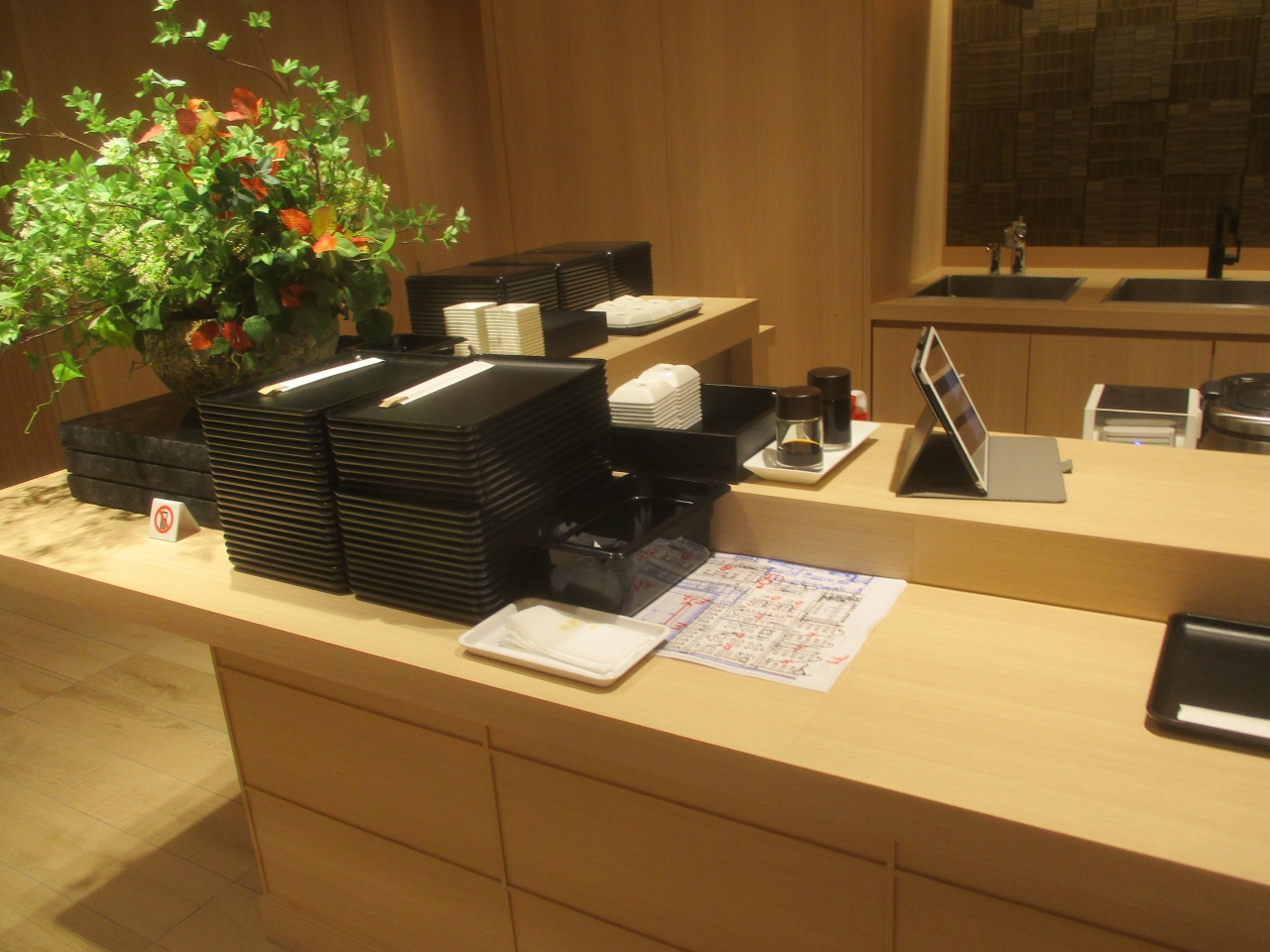 羽田空港国際線 JALファーストクラスラウンジに寿司カウンターが出来ていました。作り置きのお寿司ではなく、以前の成田空港本館のファーストクラスラウンジのようにオーダーすると板前さんが握ってくれます。鉄板で調理するホットメニューの対応はなくなったようなので、寿司カウンターが目玉となりました。