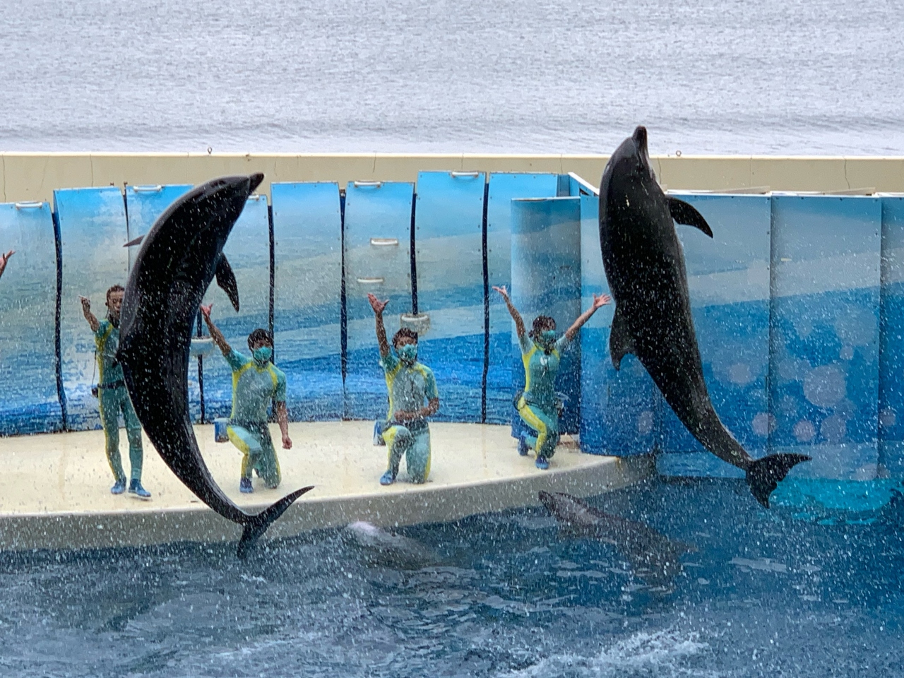 江ノ島と海をバックに見るイルカのショー、見応えがあります。