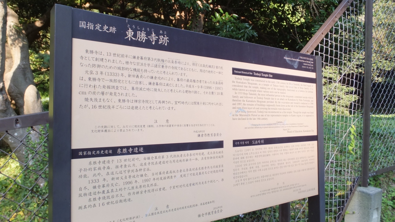 鎌倉駅からそう遠くない場所にあるのですが、少し奥まっているし、人も少なく日も陰り気味。鎌倉幕府の終焉の場所というイメージがあるから、さみしい場所に見える旧跡です。北条氏の菩提寺は今は残っていなく、説明板があるのみ。近くには北条高時らの腹切りやぐらもあります。