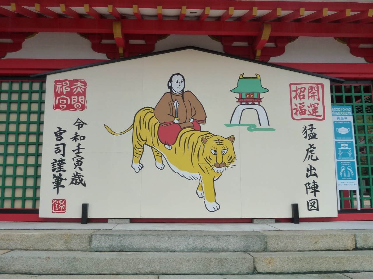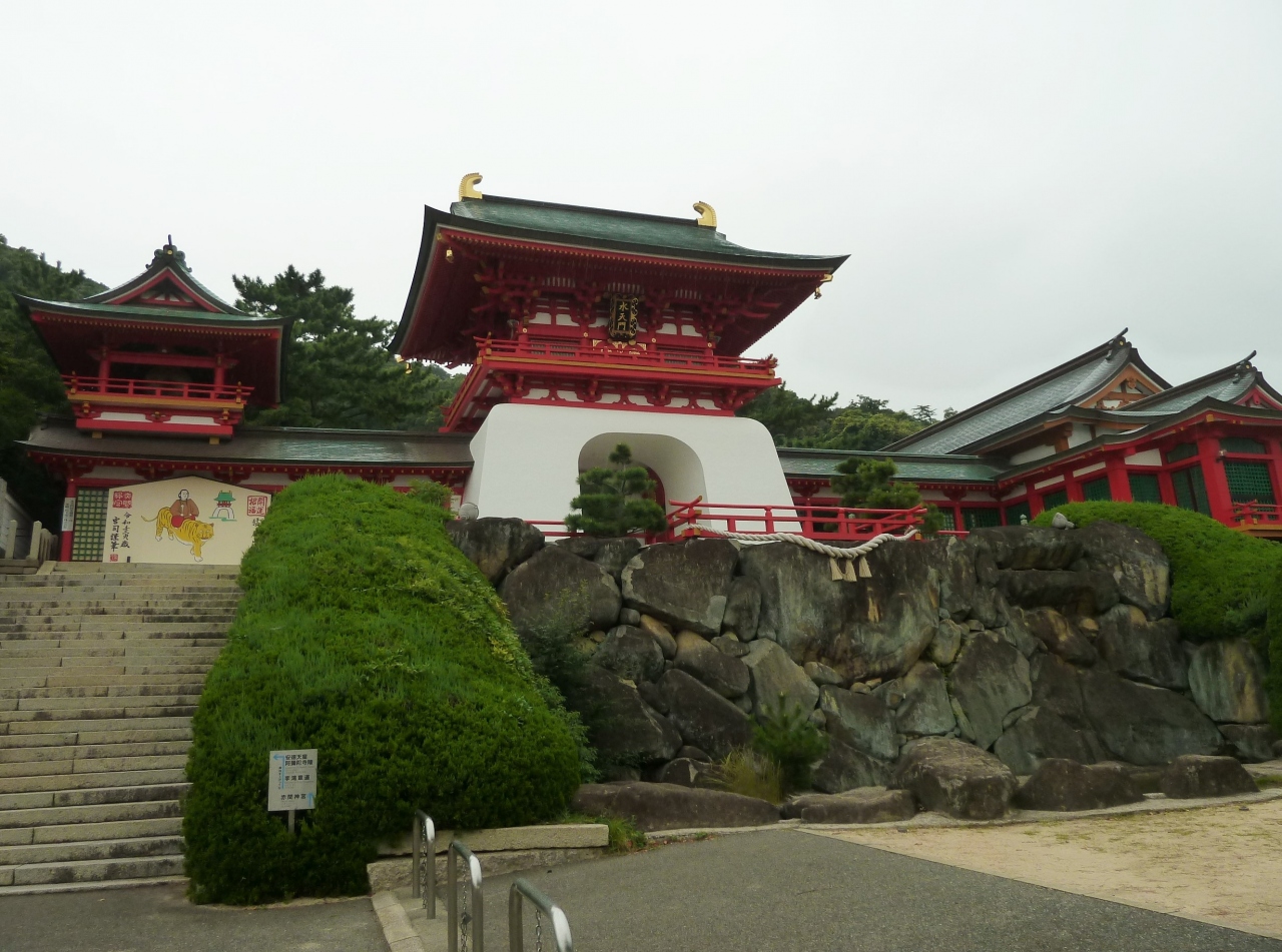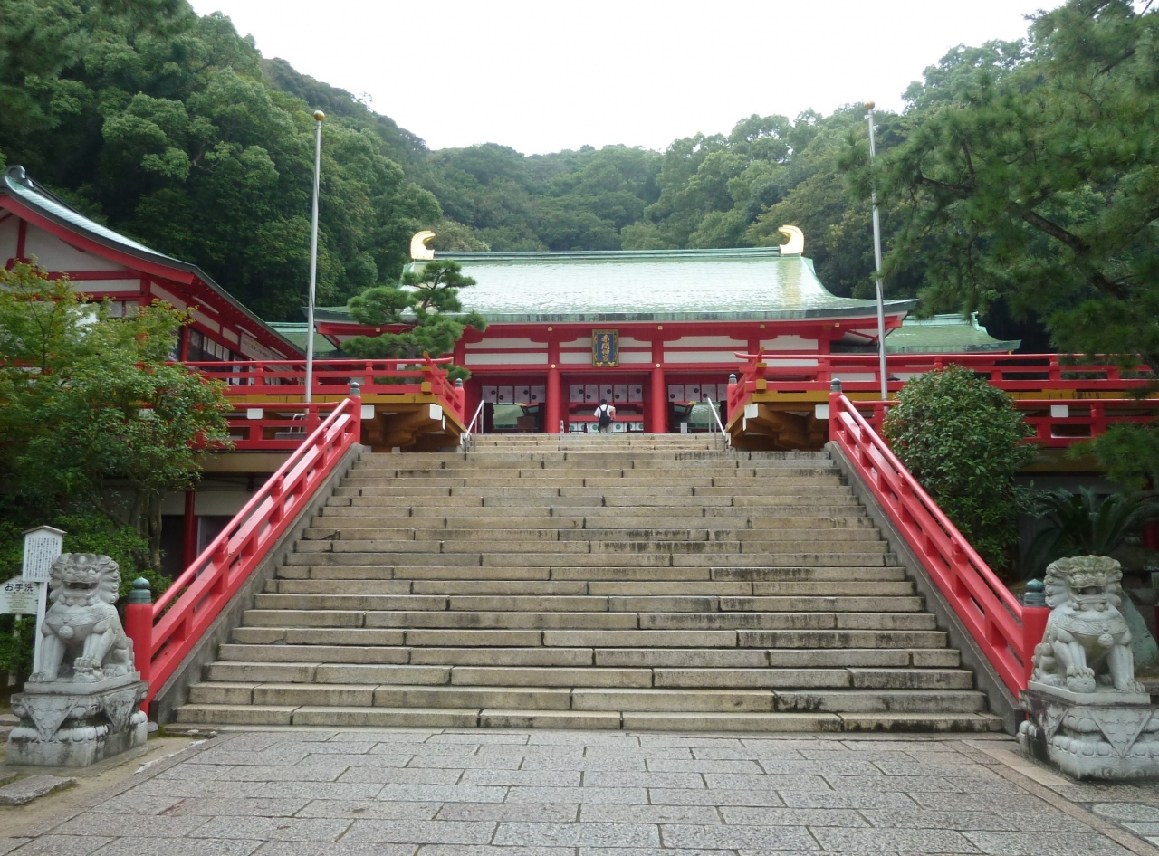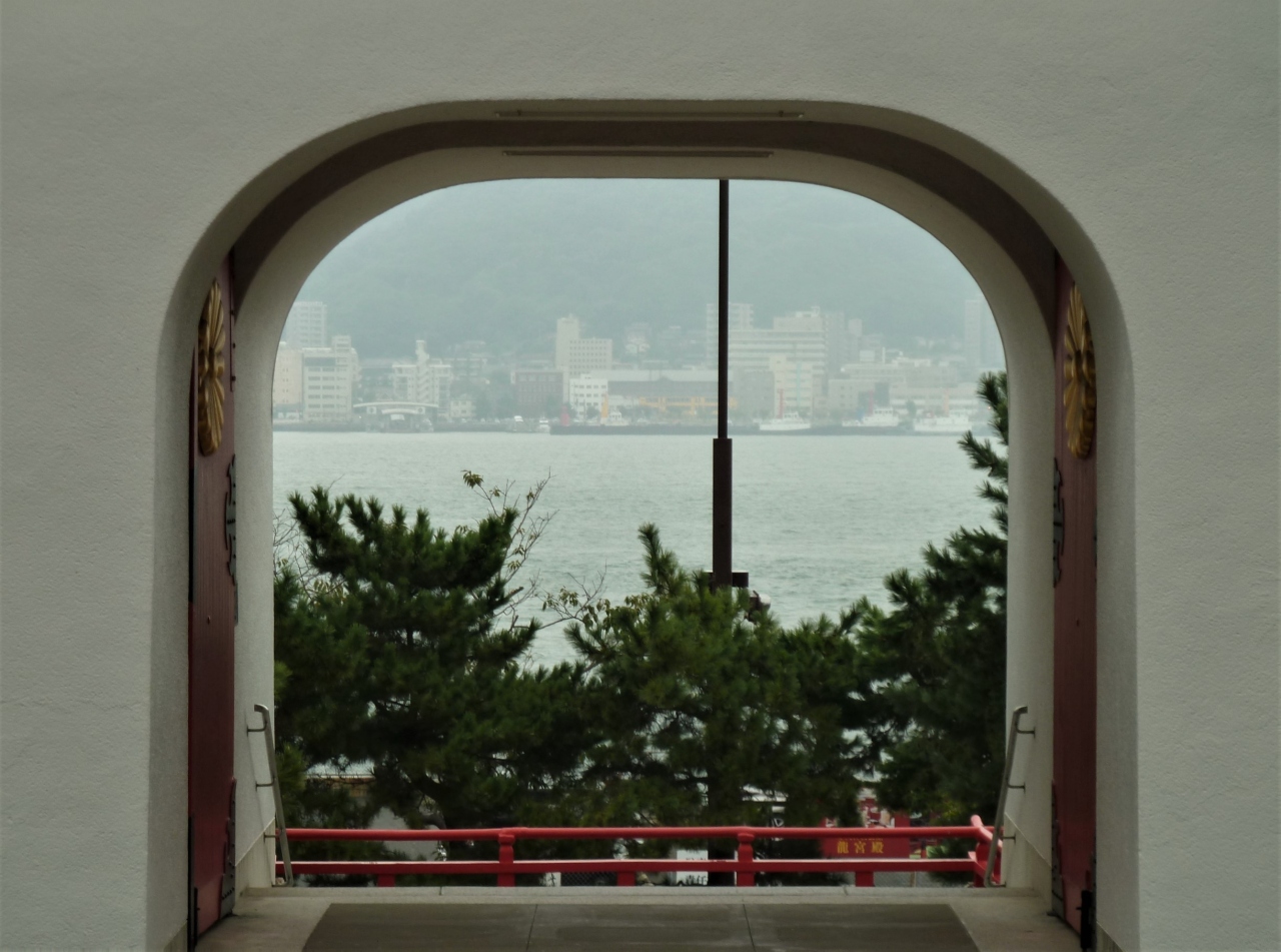 境内は石段を上りながら赤い竜宮城のような楼門である水天門をくぐり抜け参道脇には狛犬と朱色の手摺が在り、更に石段を上がれば拝殿が佇み古より海峡を見守っています。