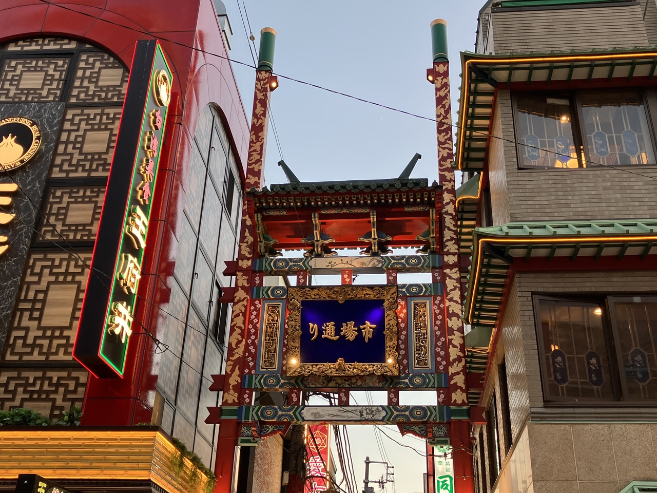 週末の午後に横浜中華街を訪れた際に見つけました。市場通りの両端に一基ずつある門です。善隣門など他の中華街の門に比べると、少し小さい印象があります。道幅も狭いですが、美味しそうなお店が並んでおり、多くの人で賑わっていました。