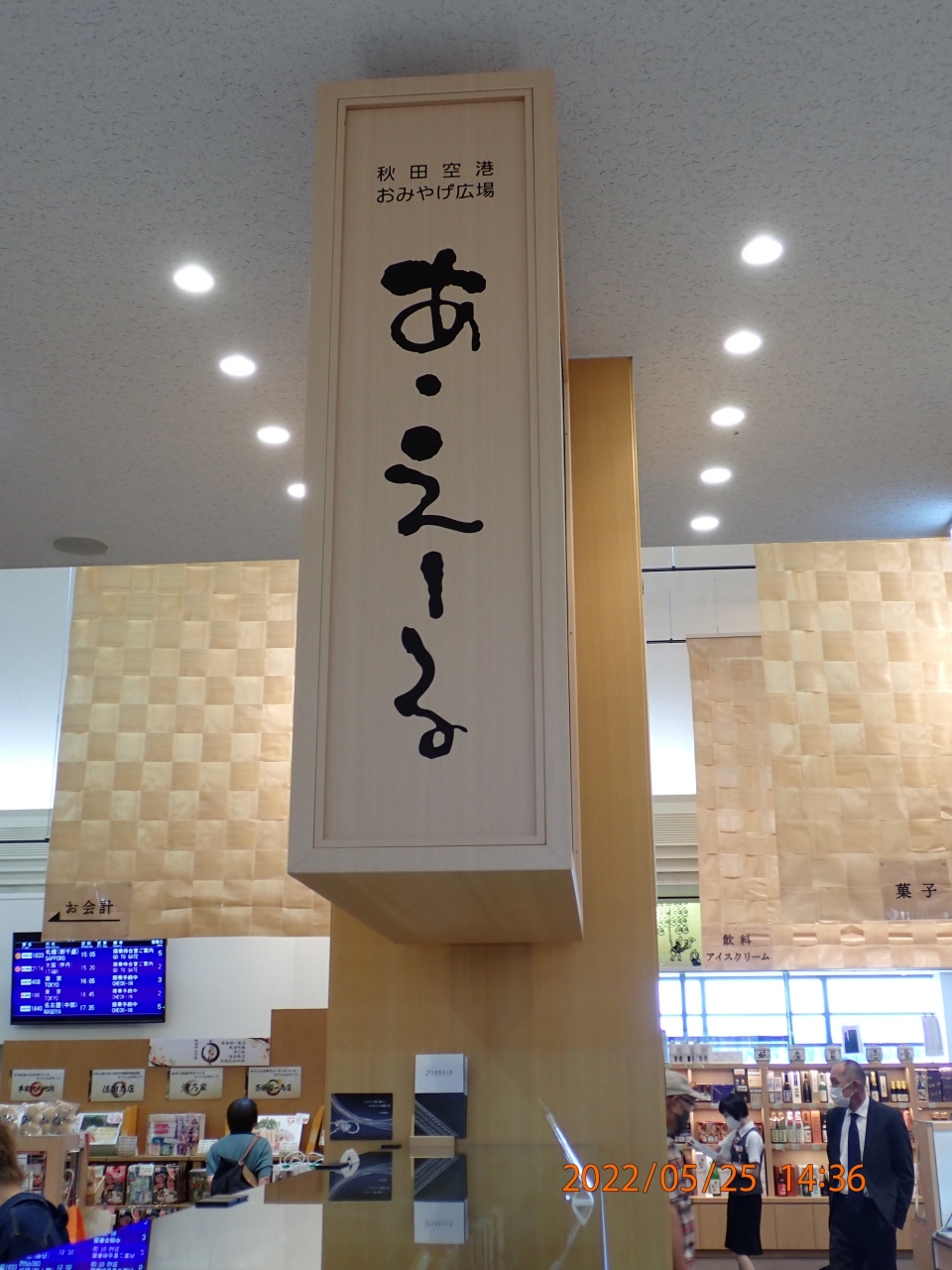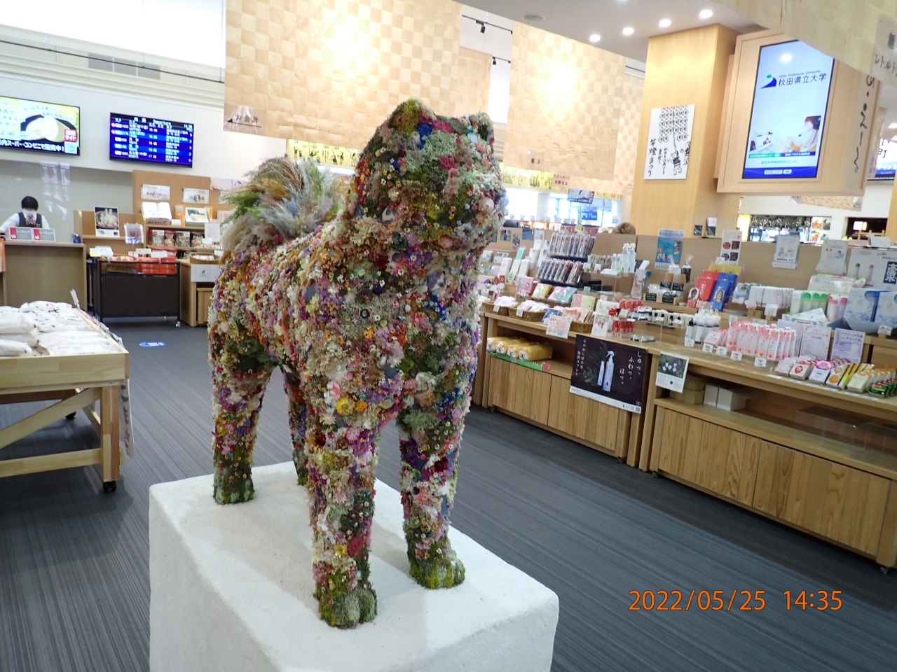 秋田市観光で立ち寄りました。おみやげ広場「あ・えーる」は、秋田空港2階にある広いお土産屋さんでした。2階フロアの中では一番広いスペースを使っている印象でした。気になる秋田のお土産は一通りそろっていた記憶があります。花で装飾された「おしゃれな秋田犬」が開港40周年記念として飾られていました。