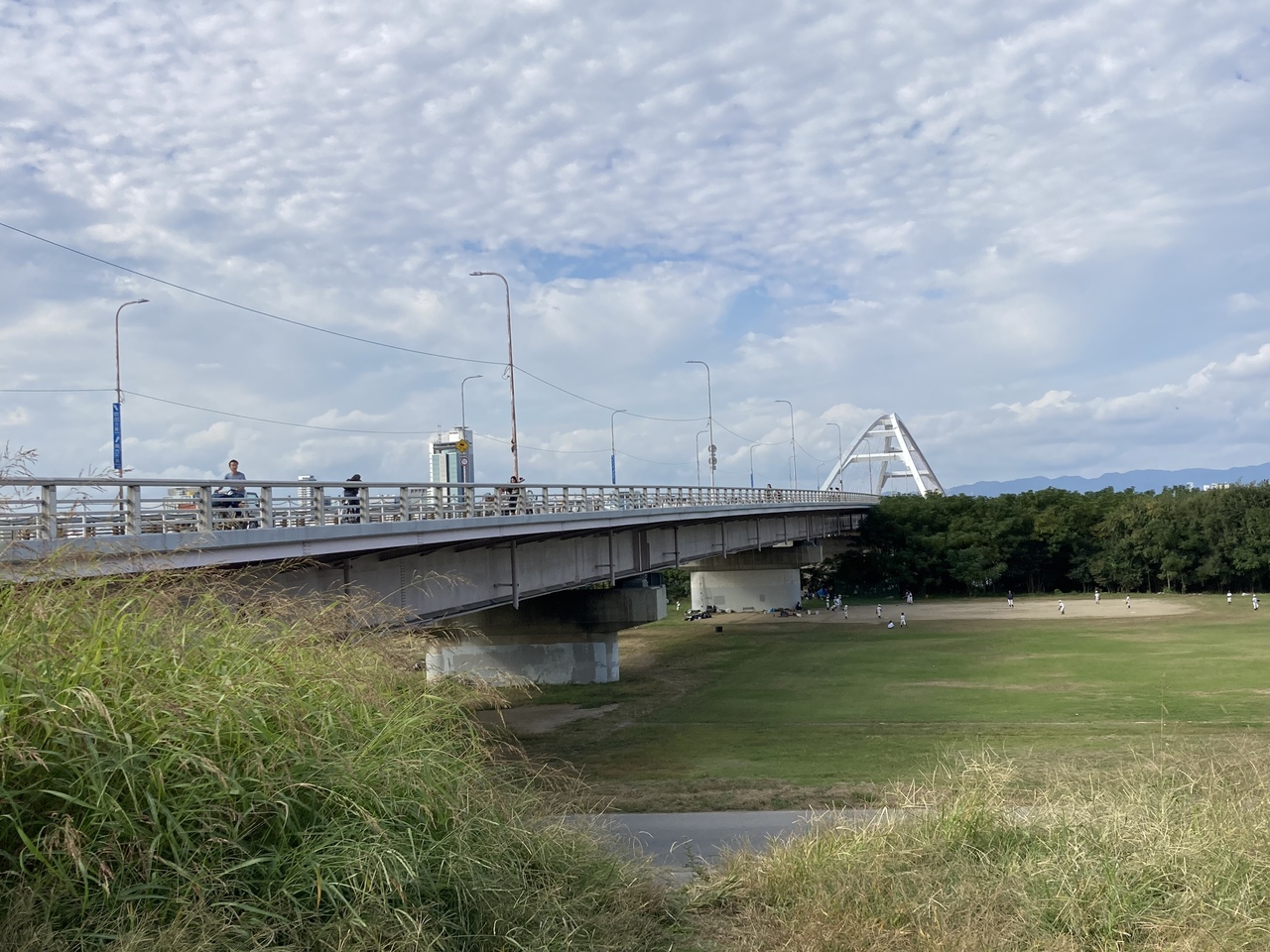 河川敷には大きな広場があり、草野球などもできる公園になっていて、この橋を含めて散歩すると気持ちいいです。